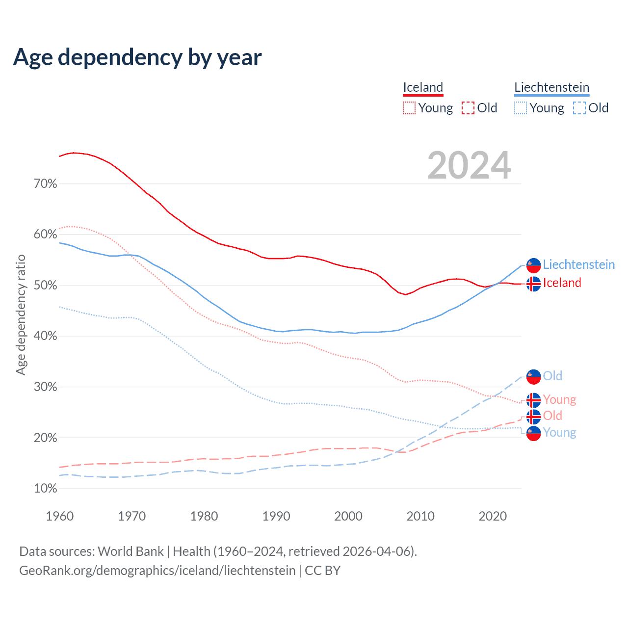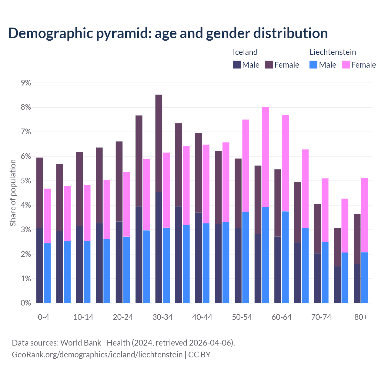 - The share of old-age demographic (65+) in Iceland is 15.6% vs 20.7% in Liechtenstein.
