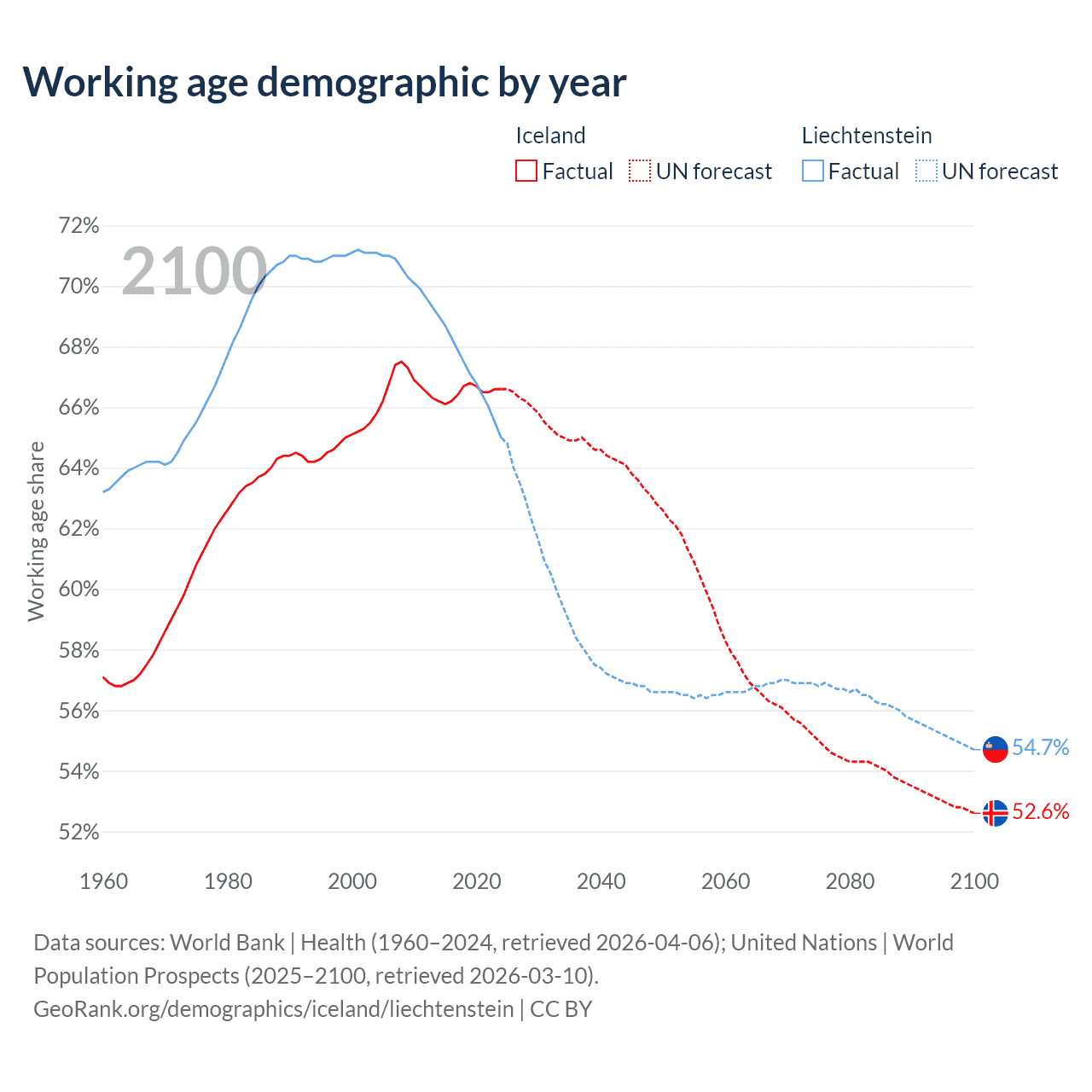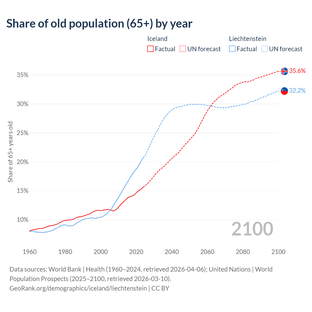 Median age Iceland vs Liechtenstein, 1960-2100