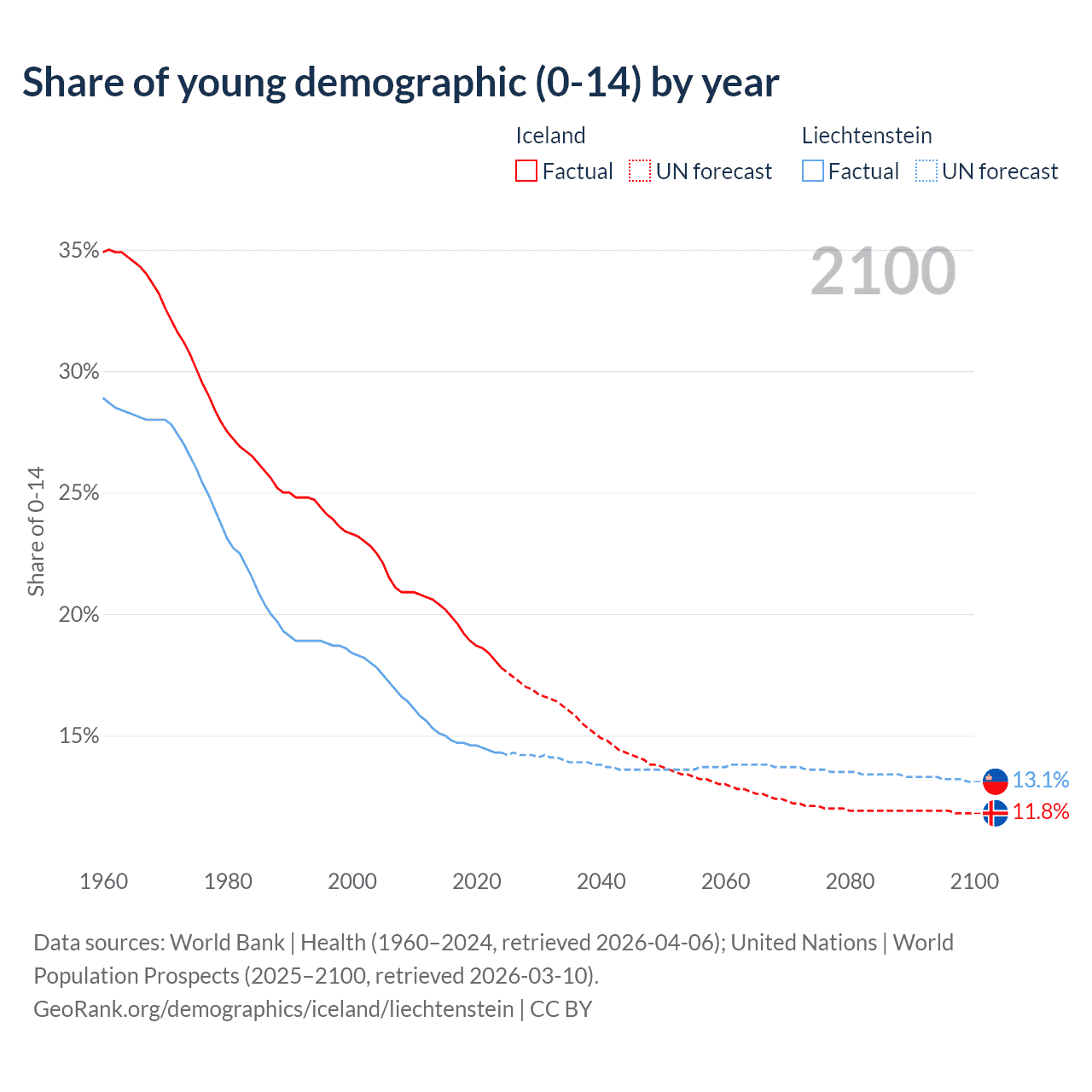 - The share of young demographic (0-15 years old) in Iceland is 17.8% vs 14.3% in Liechtenstein.