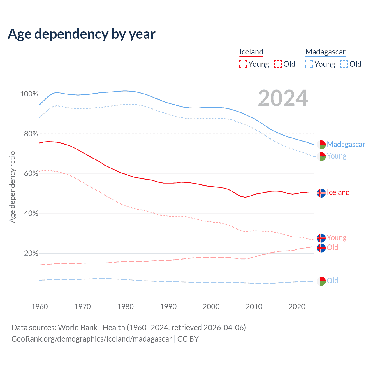 - The share of young demographic (0-15 years old) in Iceland is 17.8% vs 39.3% in Madagascar.