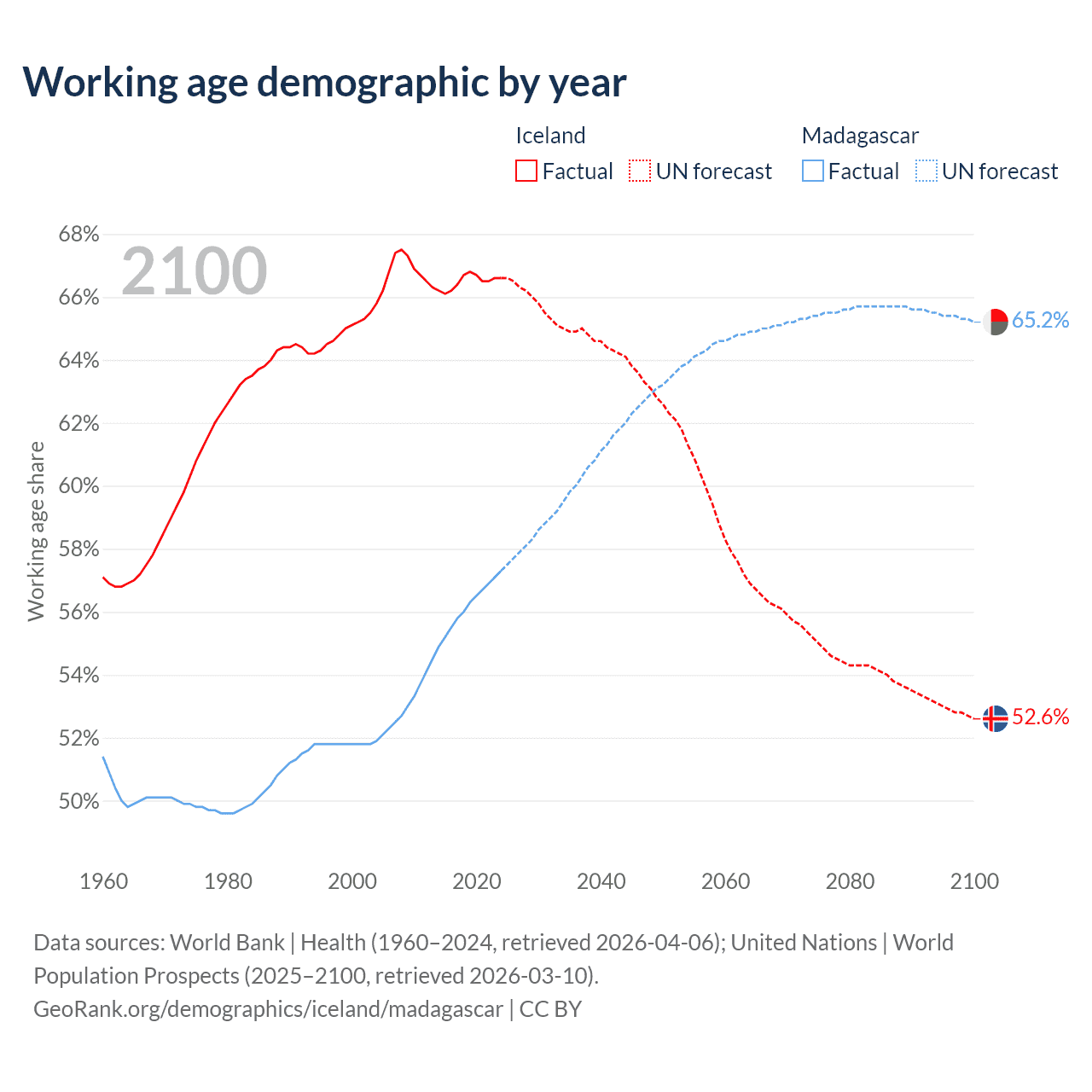 Median age Iceland vs Madagascar, 1960-2100