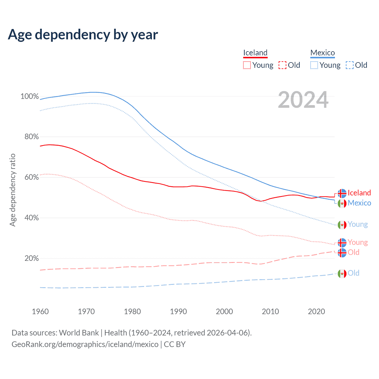 Data sources: World Bank | Health (1960–2024, retrieved 2026-04-06); U.S. Census Bureau (1960–2024, retrieved 2026-02-08).