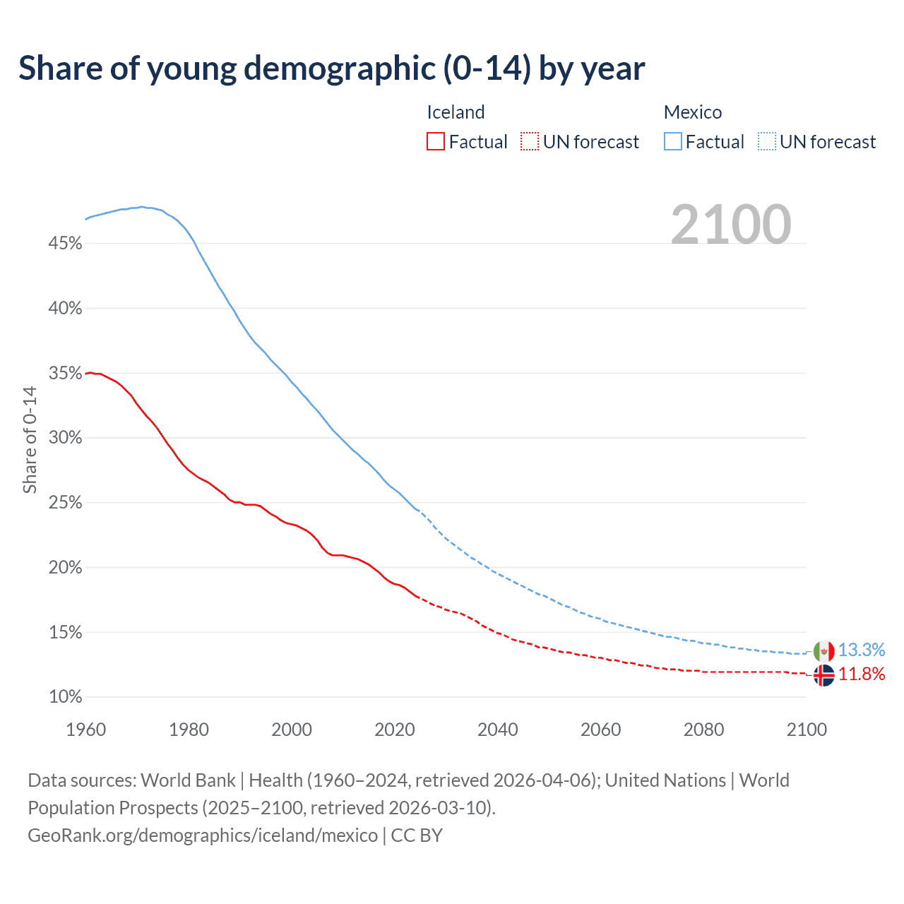 - The share of young demographic (0-15 years old) in Iceland is 17.8% vs 24.5% in Mexico.