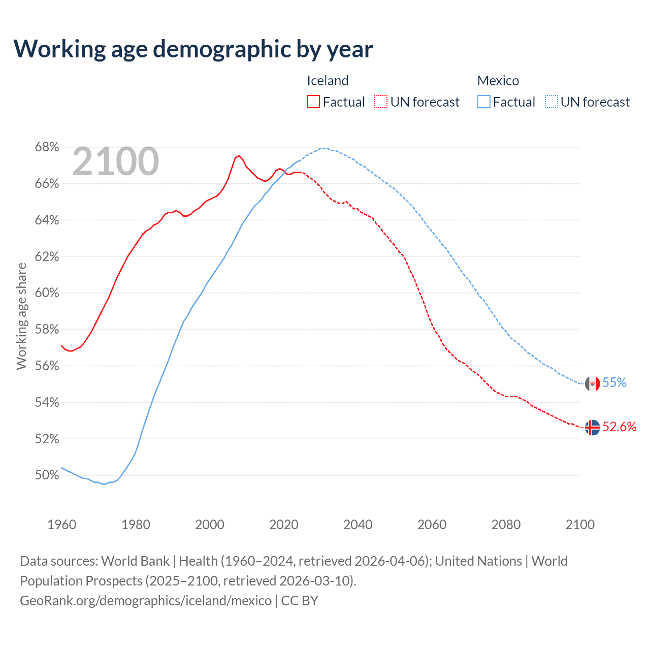 Median age Iceland vs Mexico, 1960-2100