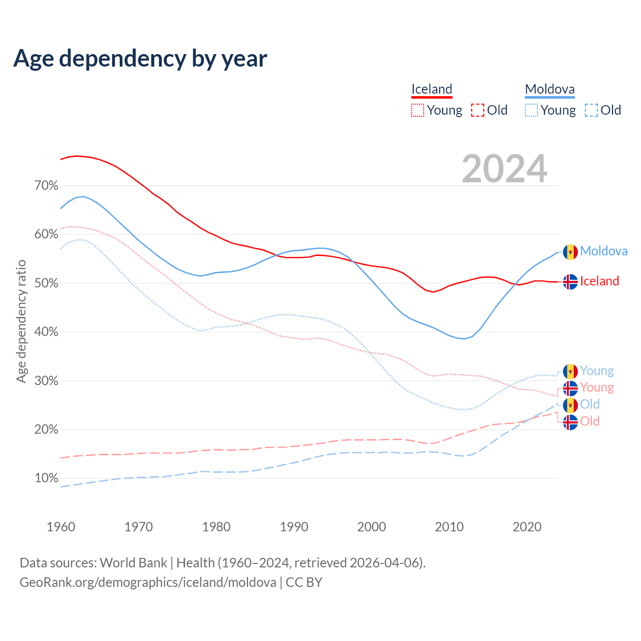 - The share of old-age demographic (65+) in Iceland is 15.6% vs 16.2% in Moldova.