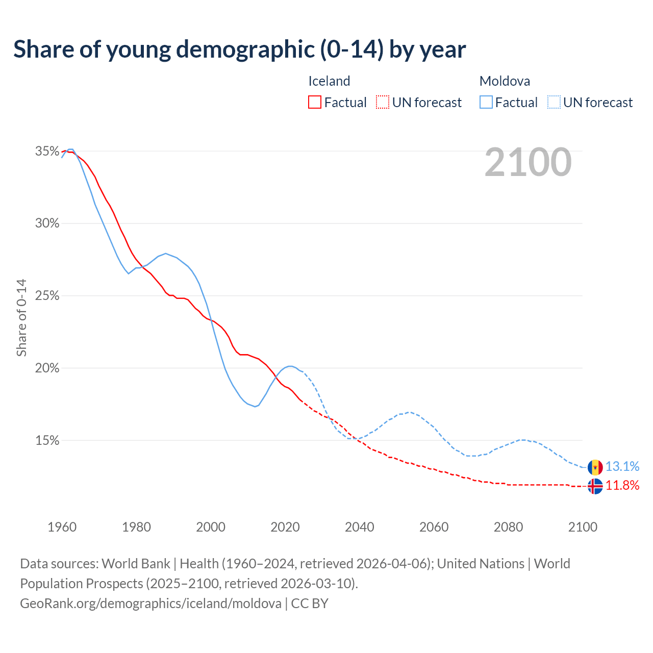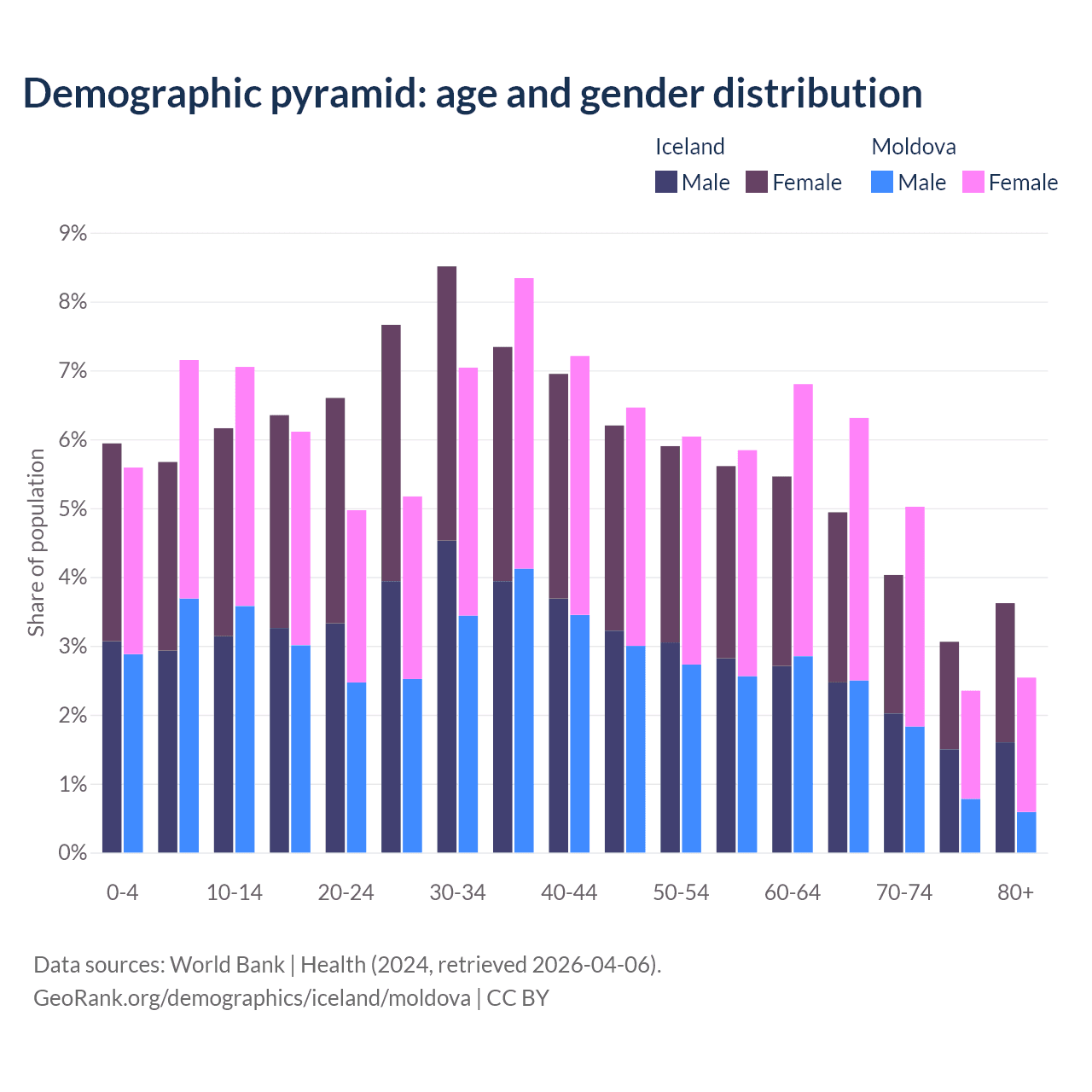 - The share of young demographic (0-15 years old) in Iceland is 17.8% vs 19.8% in Moldova.