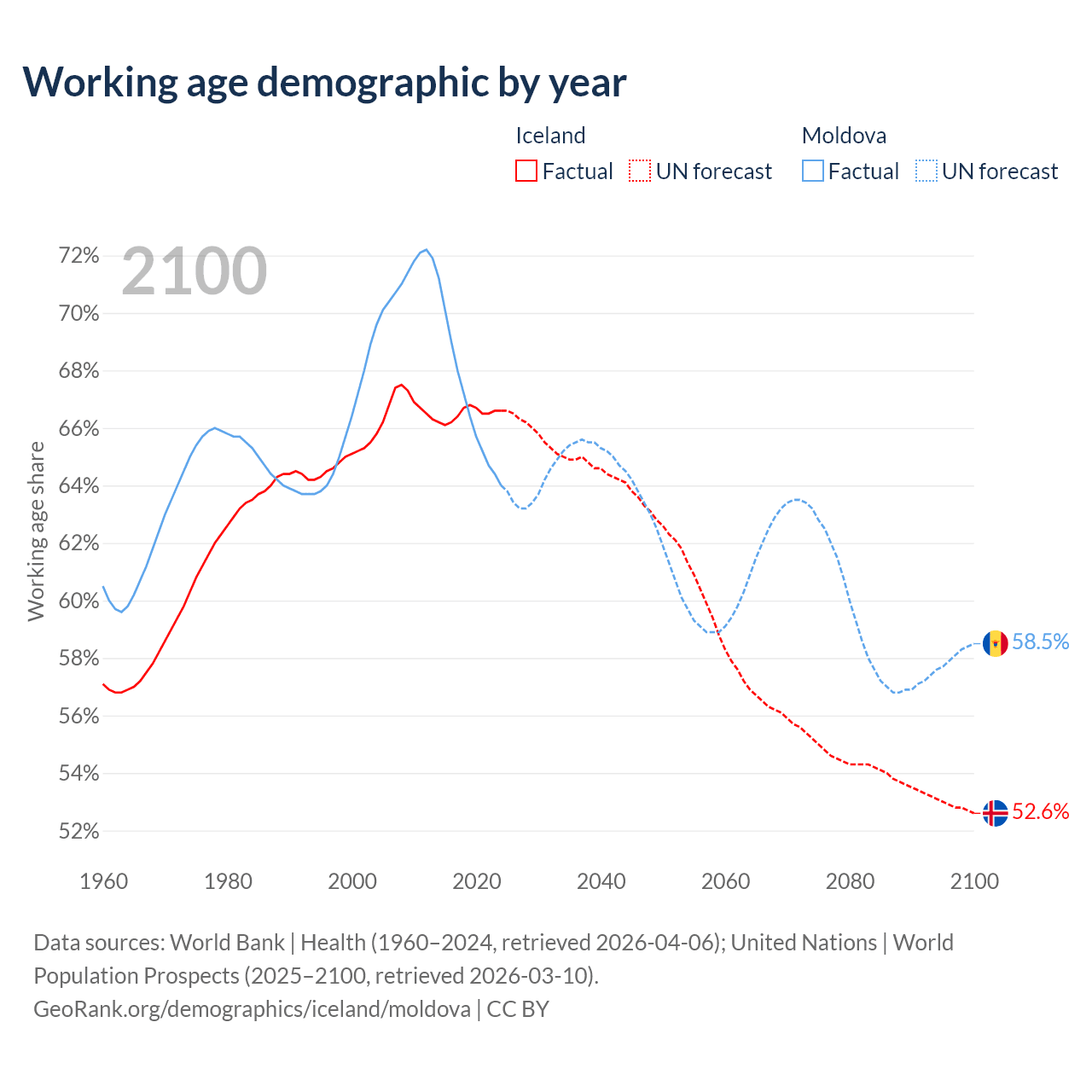 Median age Iceland vs Moldova, 1960-2100