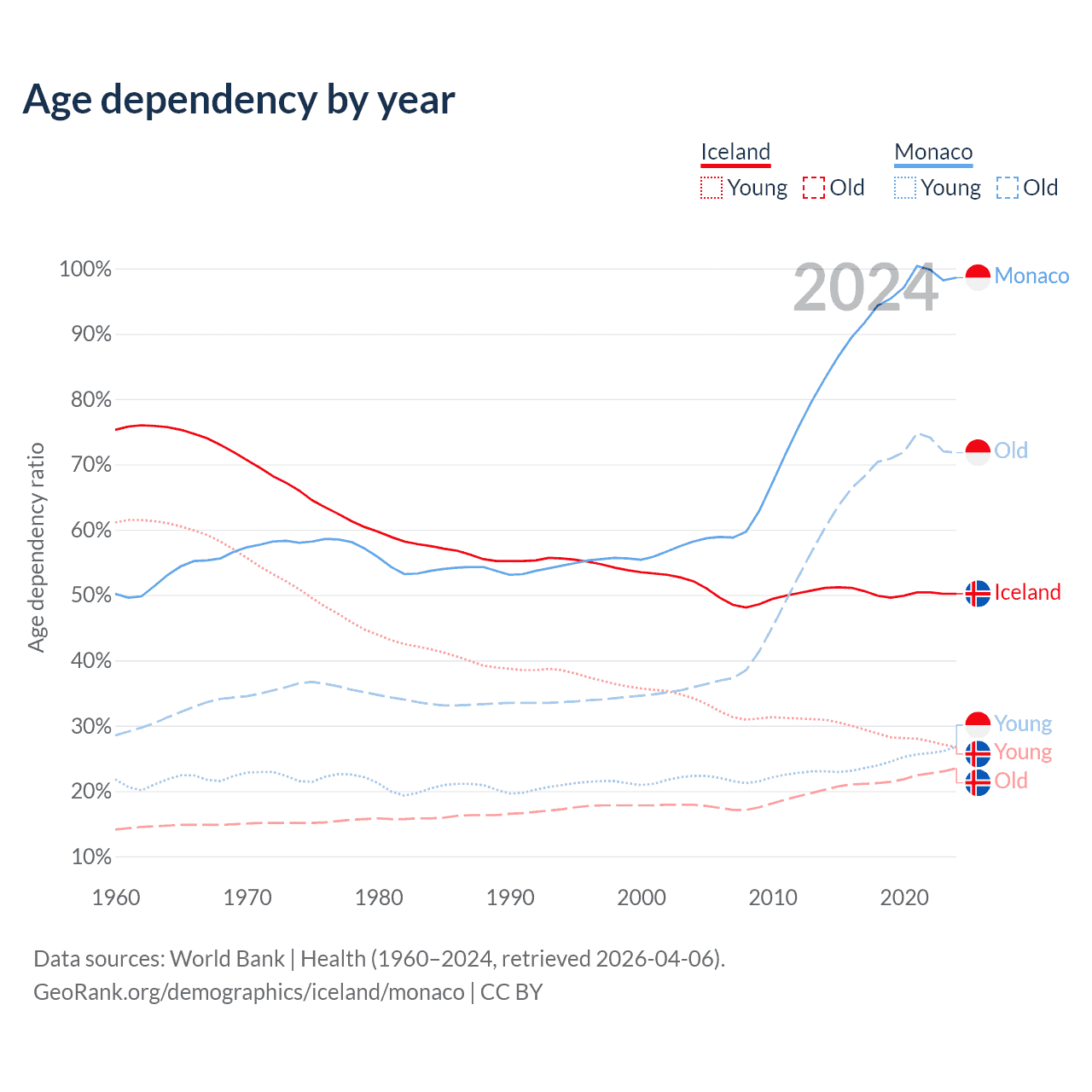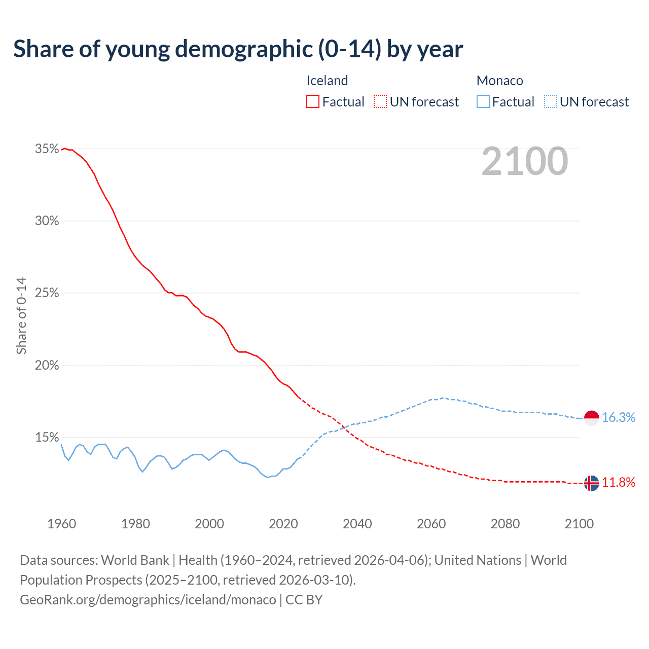 - The share of young demographic (0-15 years old) in Iceland is 17.8% vs 13.5% in Monaco.
