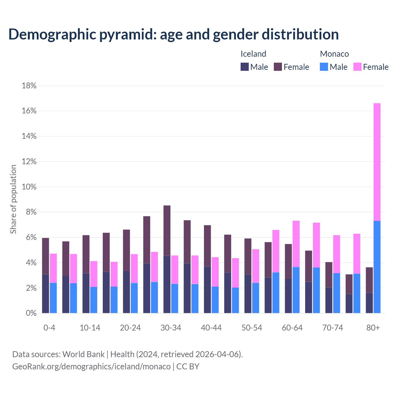 The share of older people aged 65 and over is 15.6% in Iceland and 36.2% in Monaco. Life expectancy in Iceland compared to Monaco .