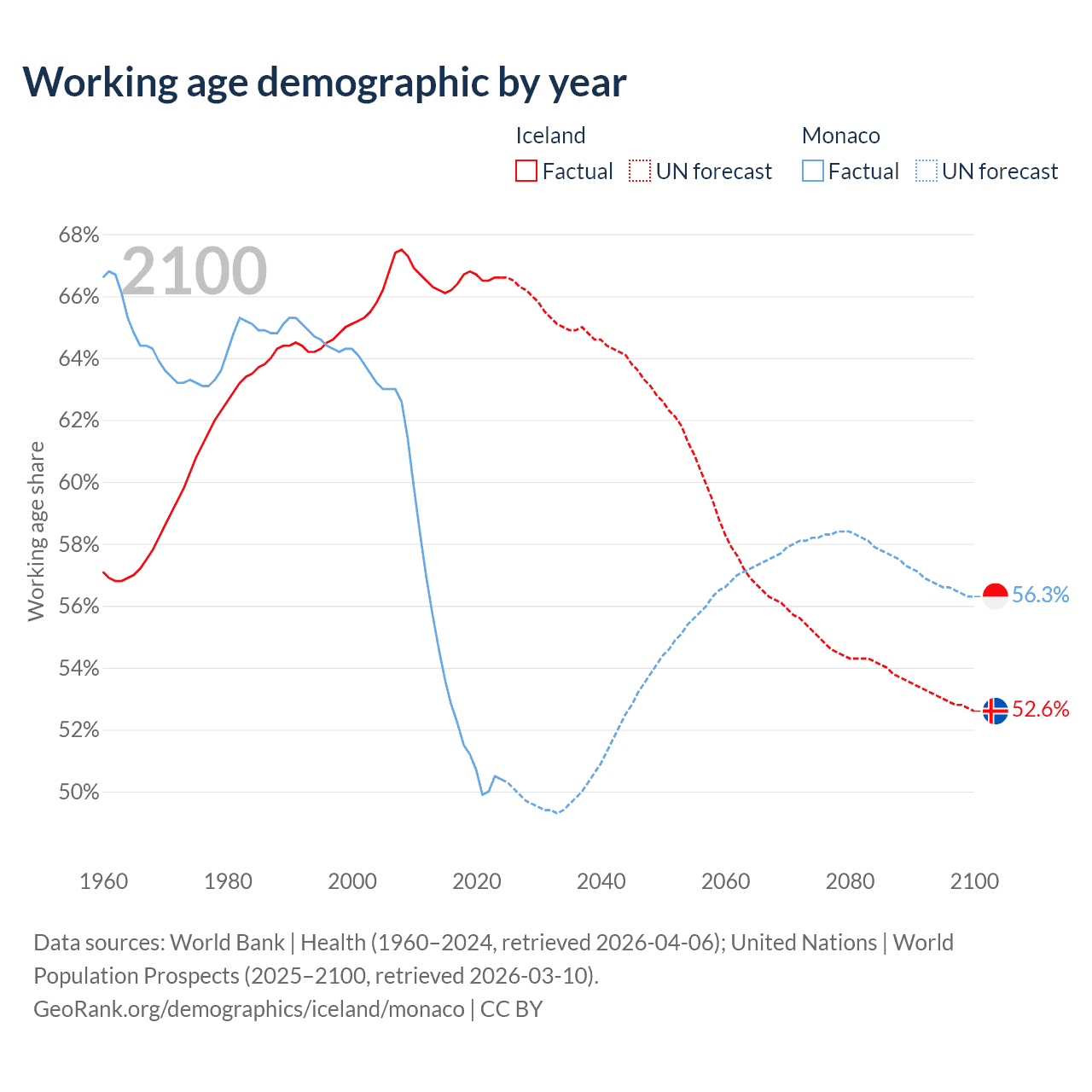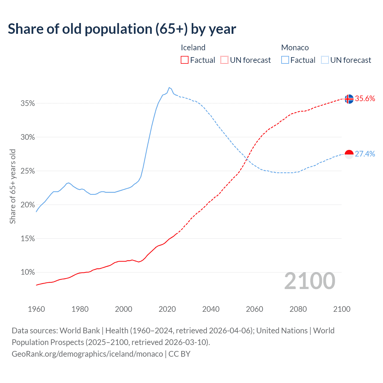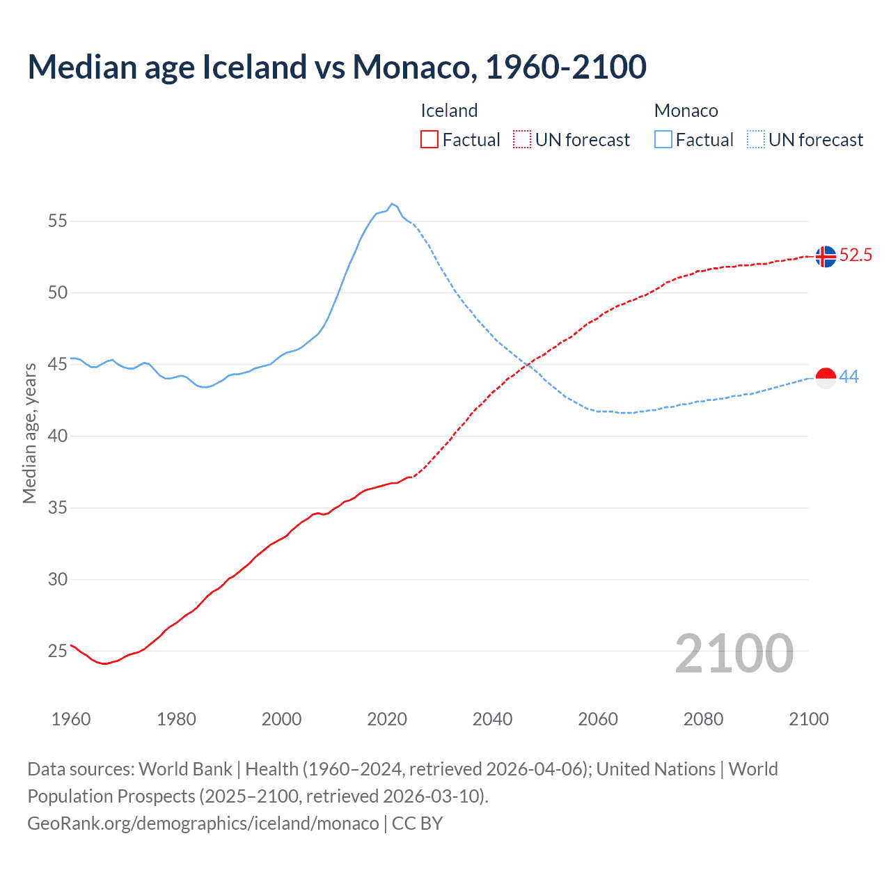 Median age Iceland vs Monaco, 1960-2100