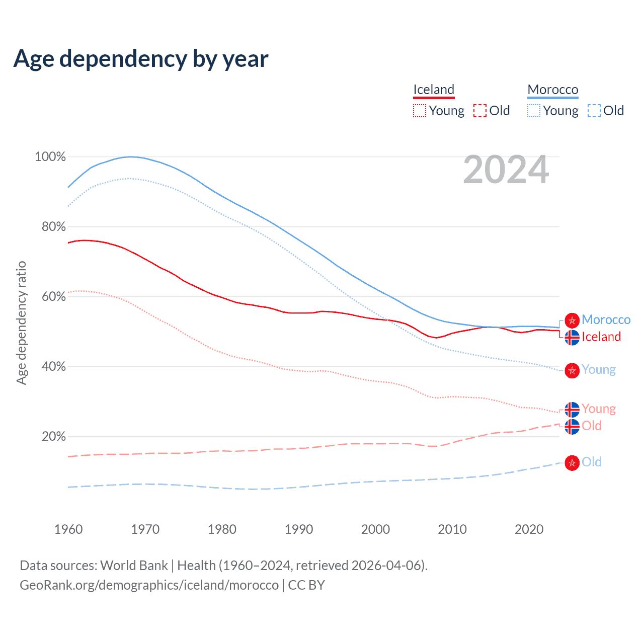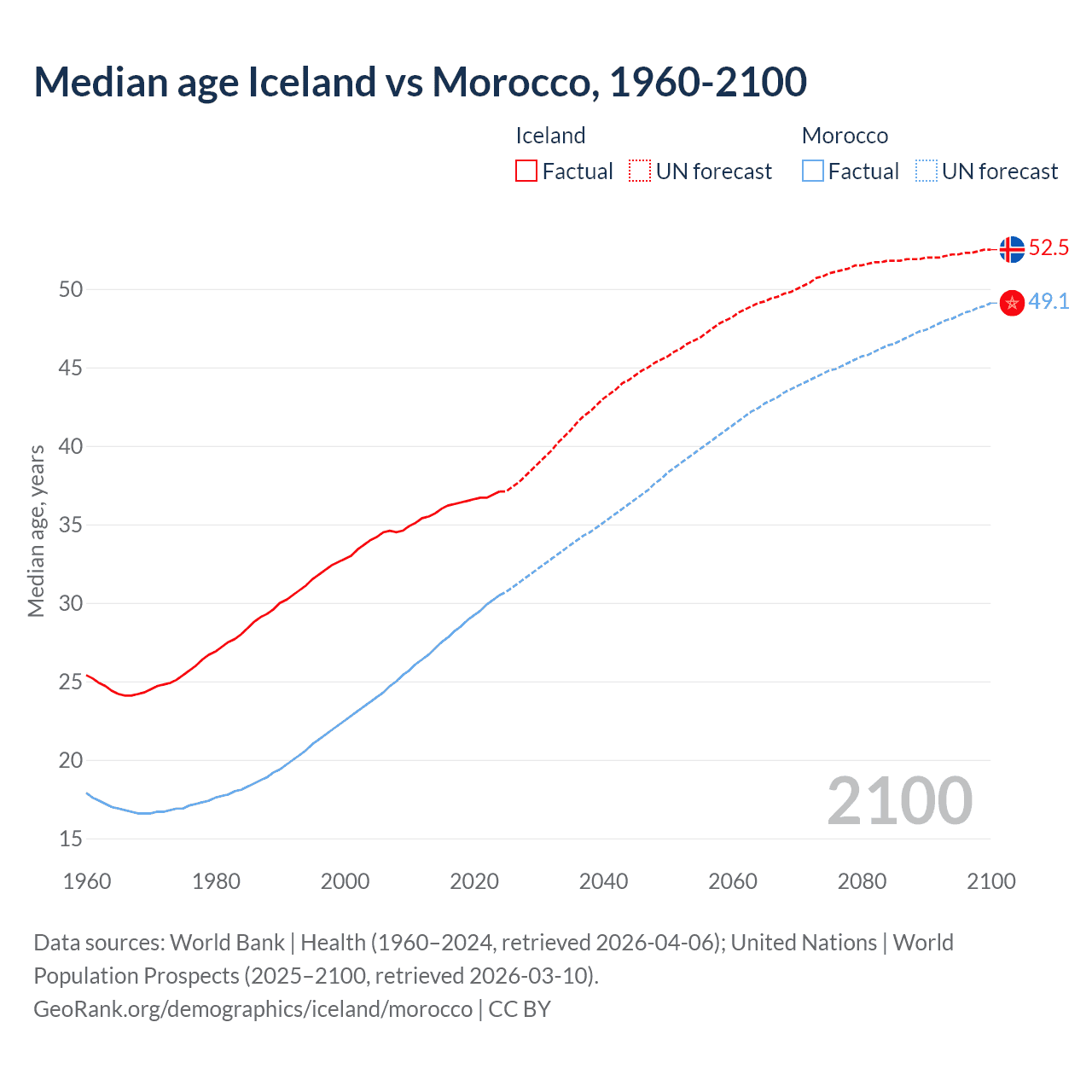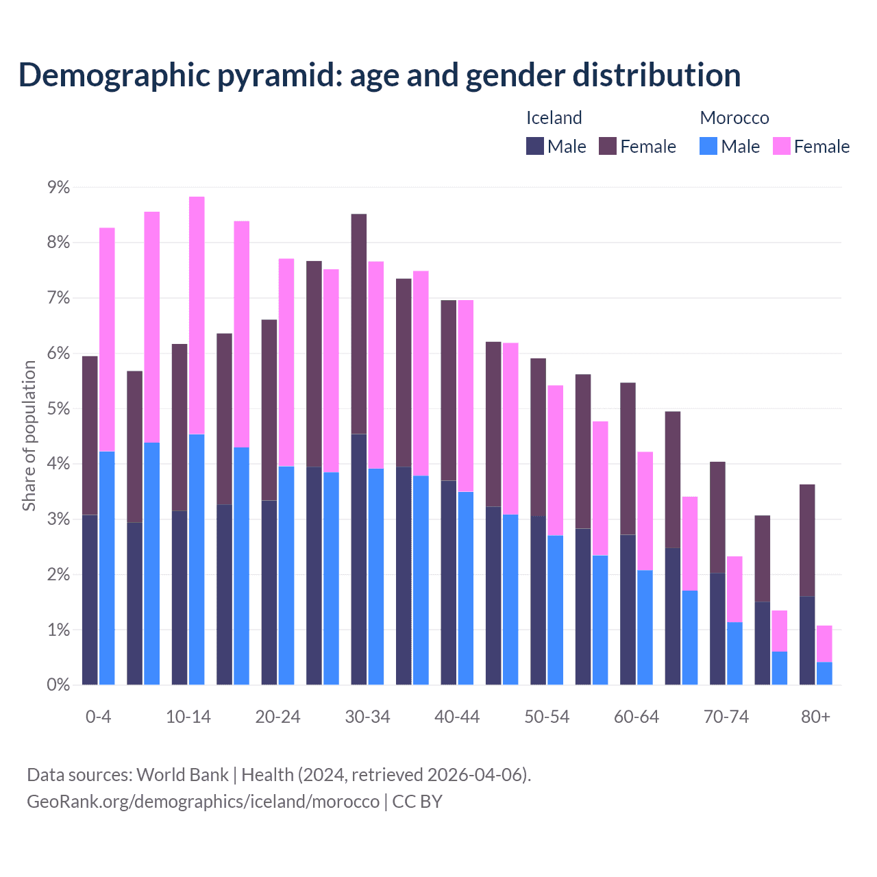 - Iceland is ranked 65/196 by median age (oldest to youngest) vs 100/196 for Morocco.