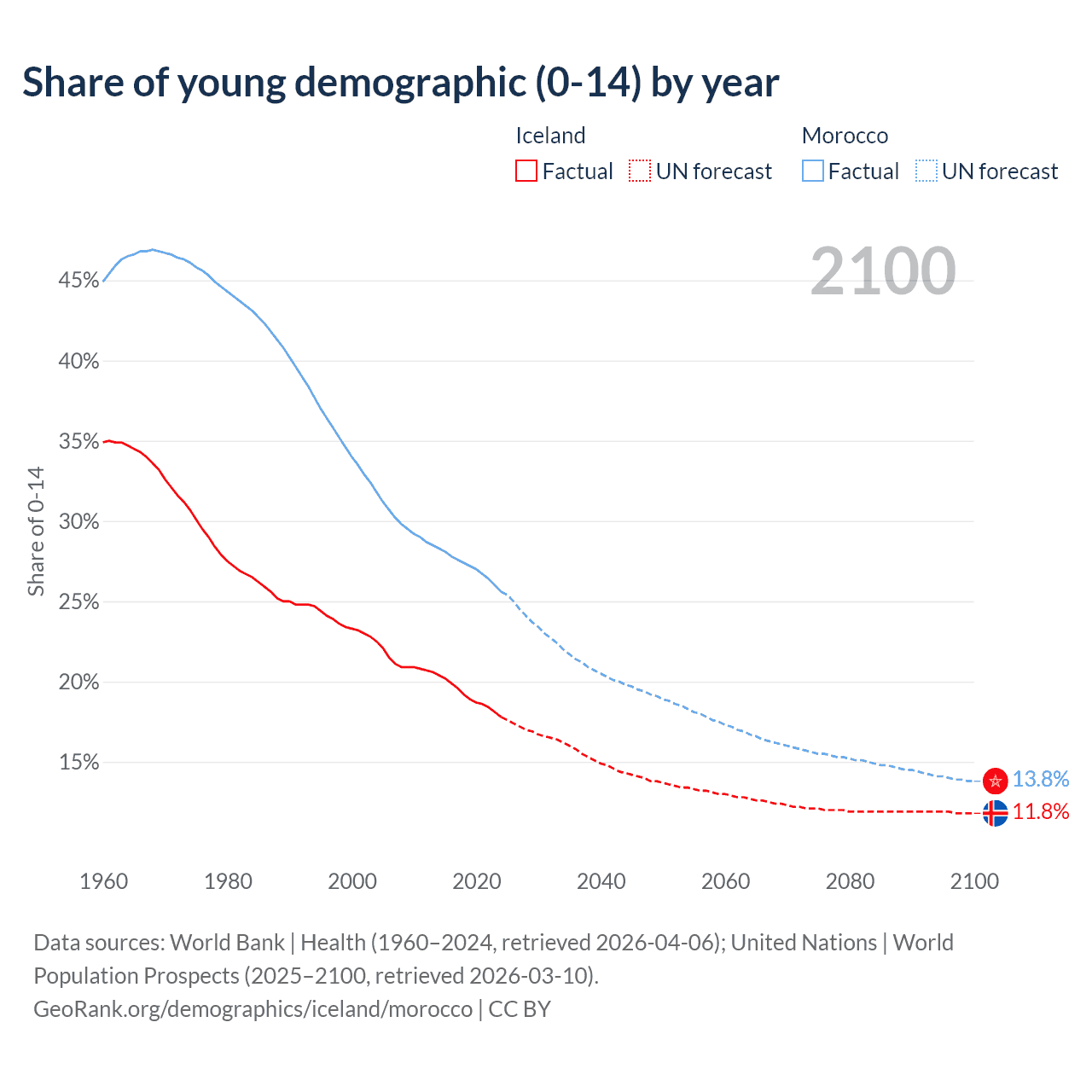 - The share of young demographic (0-15 years old) in Iceland is 17.8% vs 25.6% in Morocco.