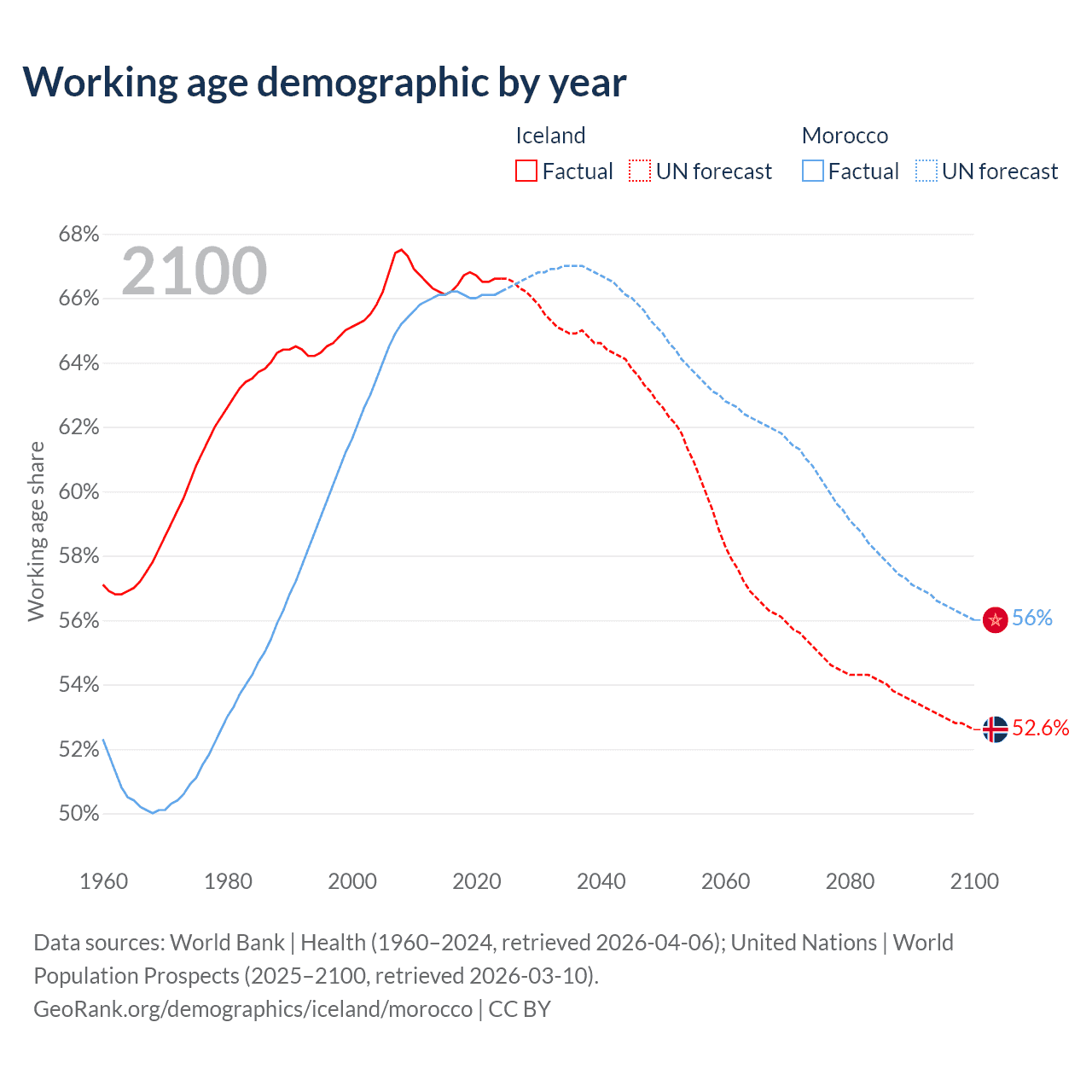 - Iceland has 264K working age adults (aged 15-64) vs 25.7M in Morocco.