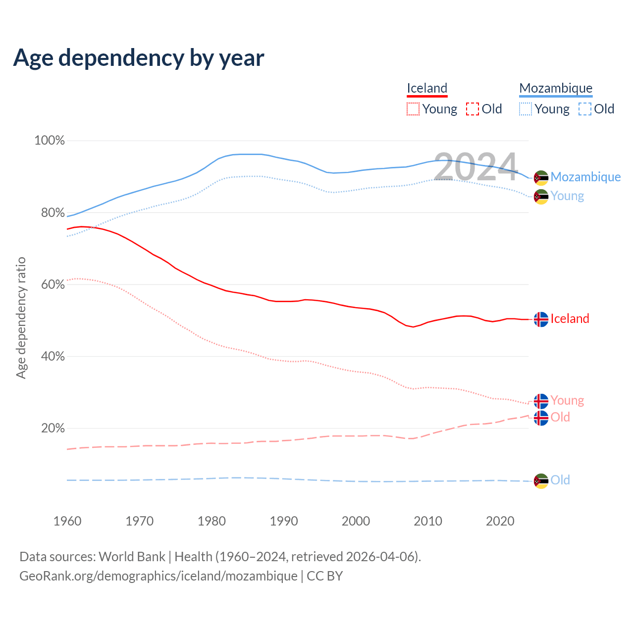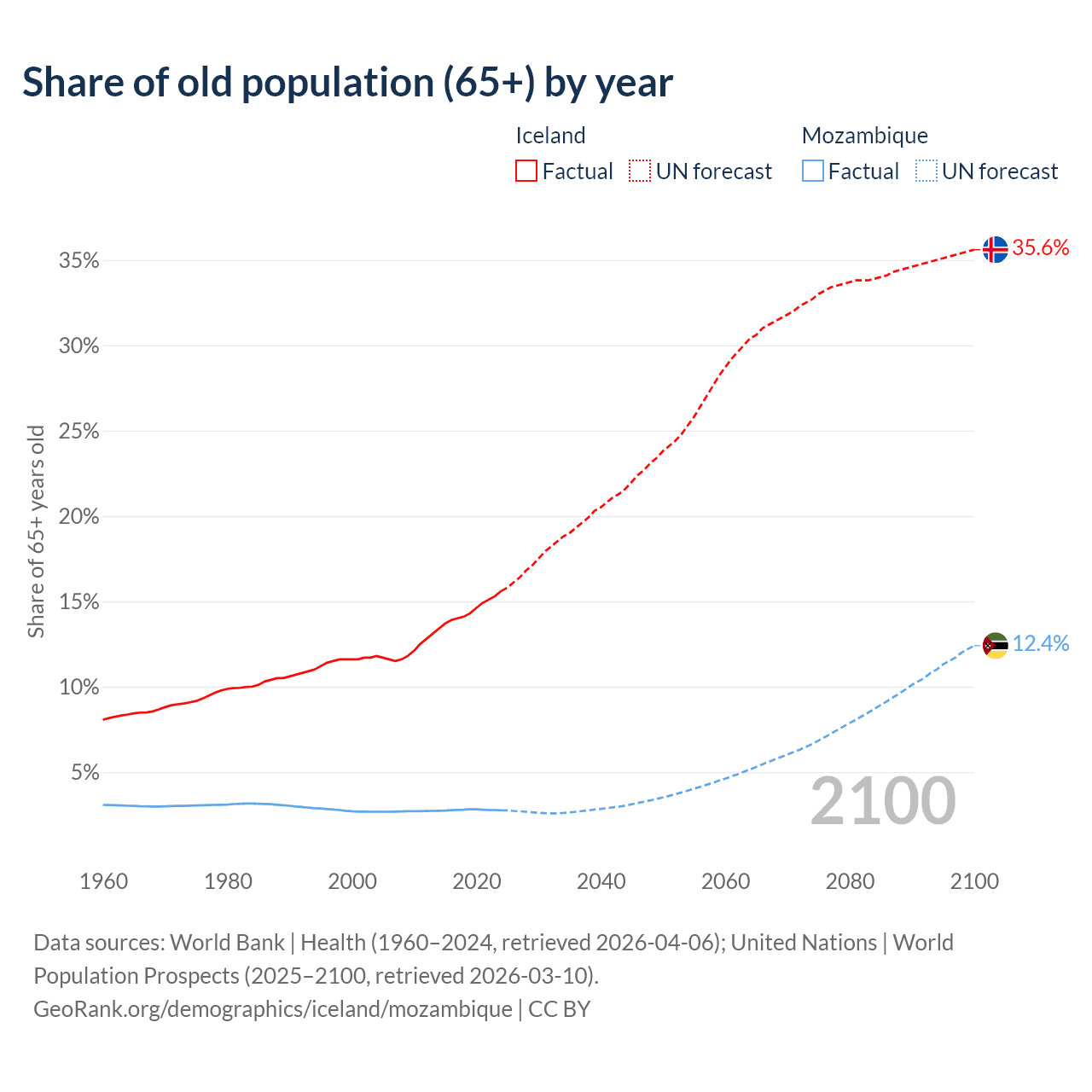 - The share of old-age demographic (65+) in Iceland is 15.6% vs 2.75% in Mozambique.