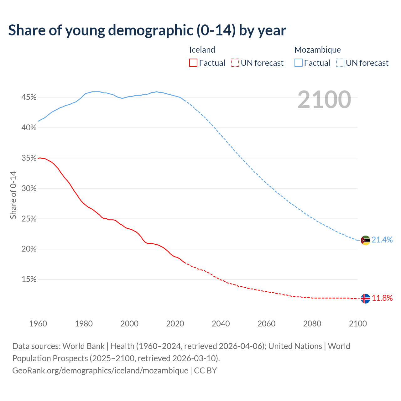 - The share of young demographic (0-15 years old) in Iceland is 17.8% vs 44.5% in Mozambique.