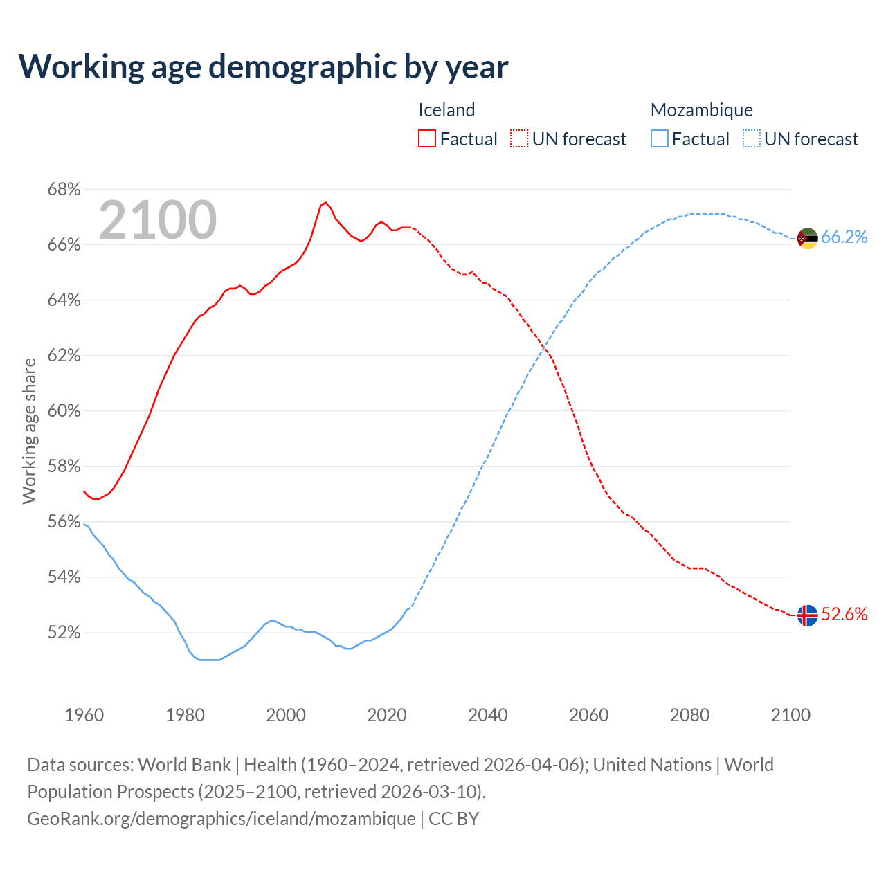 - Iceland has 264K working age adults (aged 15-64) vs 19.5M in Mozambique.