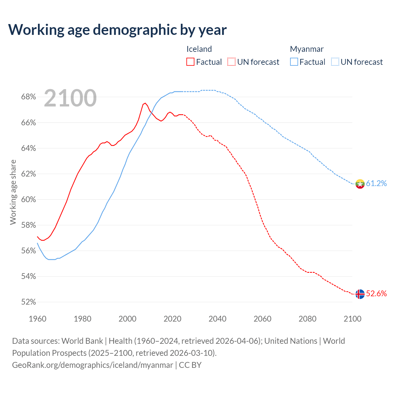 Median age Iceland vs Myanmar, 1960-2100