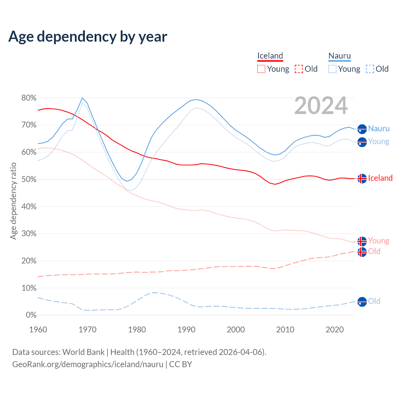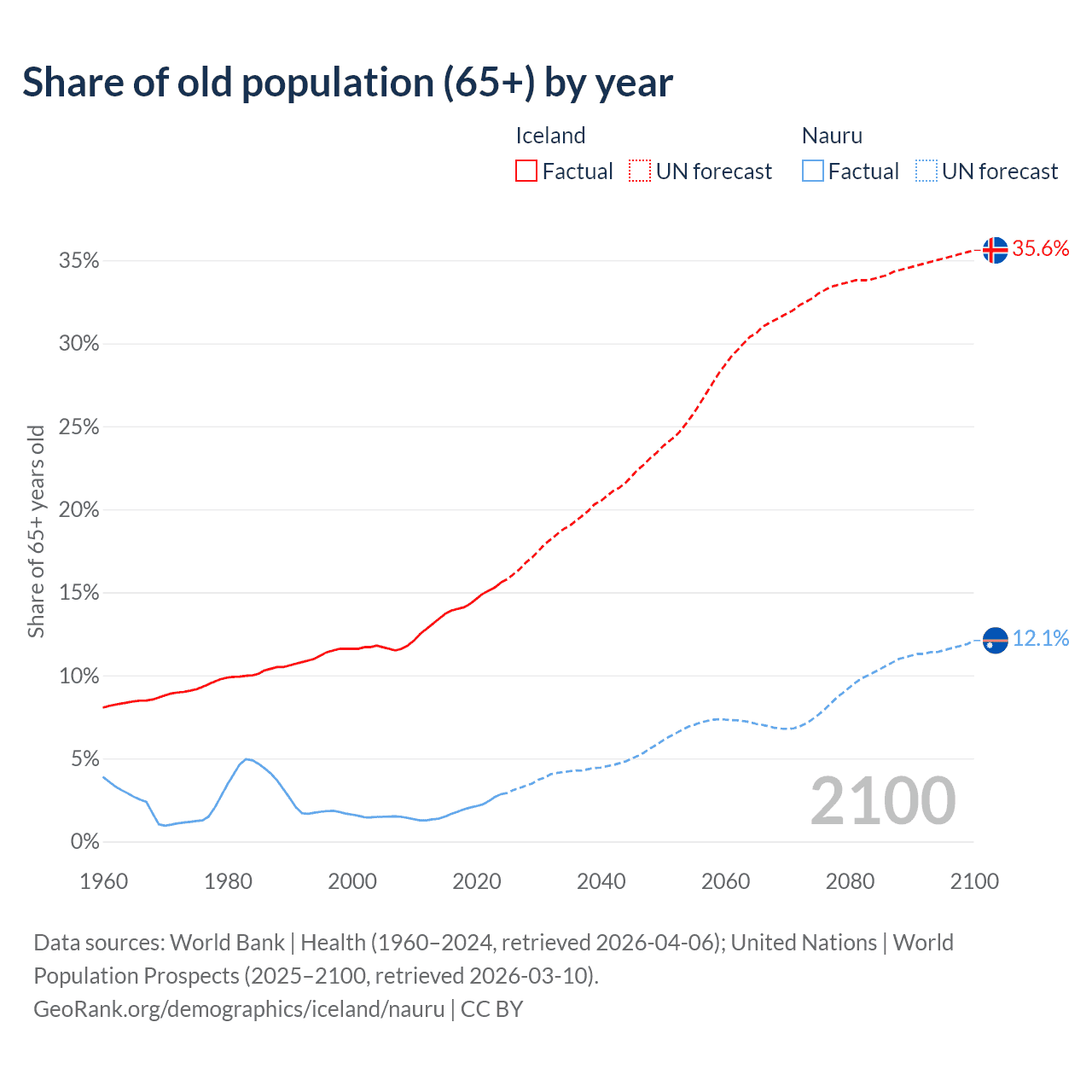 The share of older people aged 65 and over is 15.6% in Iceland and 2.85% in Nauru. Life expectancy in Iceland compared to Nauru .