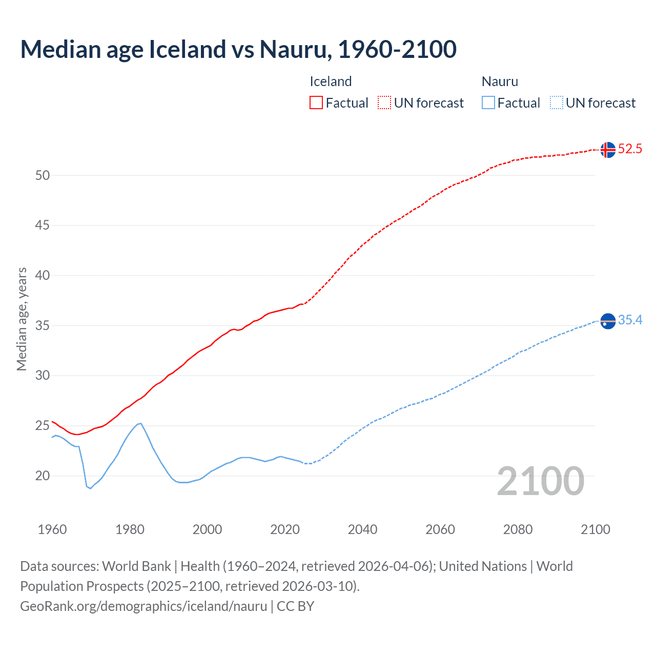 - The median age in Iceland is 37.1 years compared to 21.4 years in Nauru.