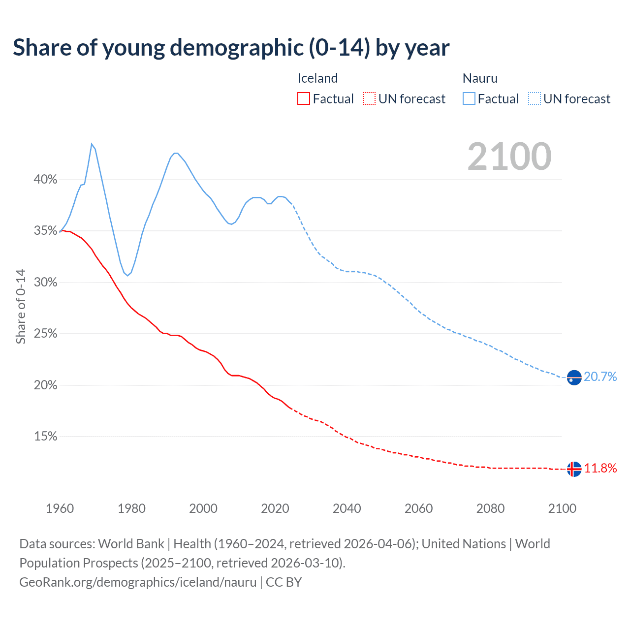 - The share of young demographic (0-15 years old) in Iceland is 17.8% vs 37.8% in Nauru.