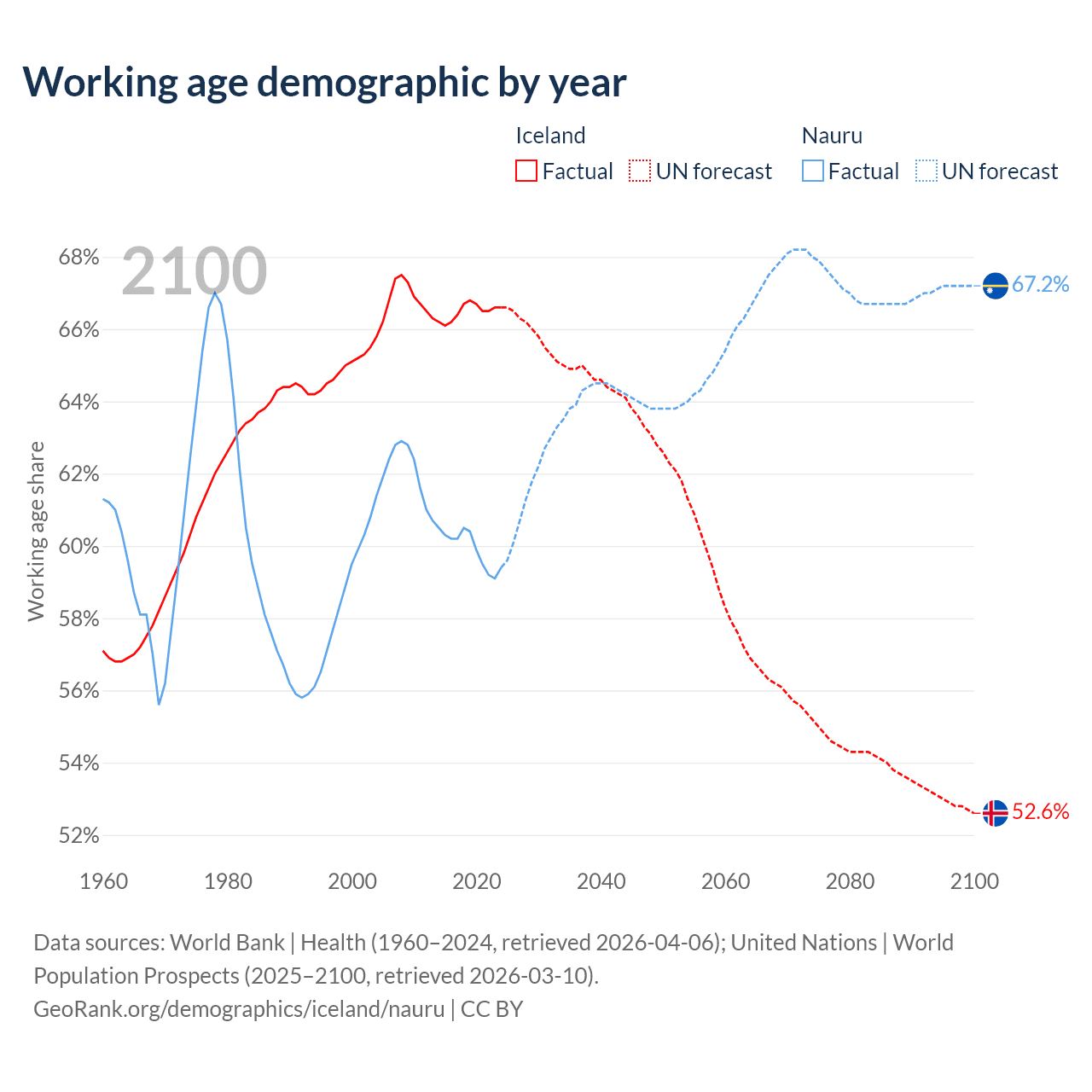 - Iceland has 264K working age adults (aged 15-64) vs 7.2K in Nauru.