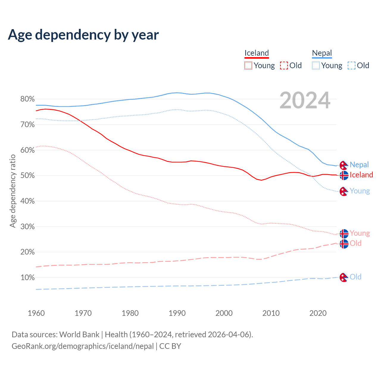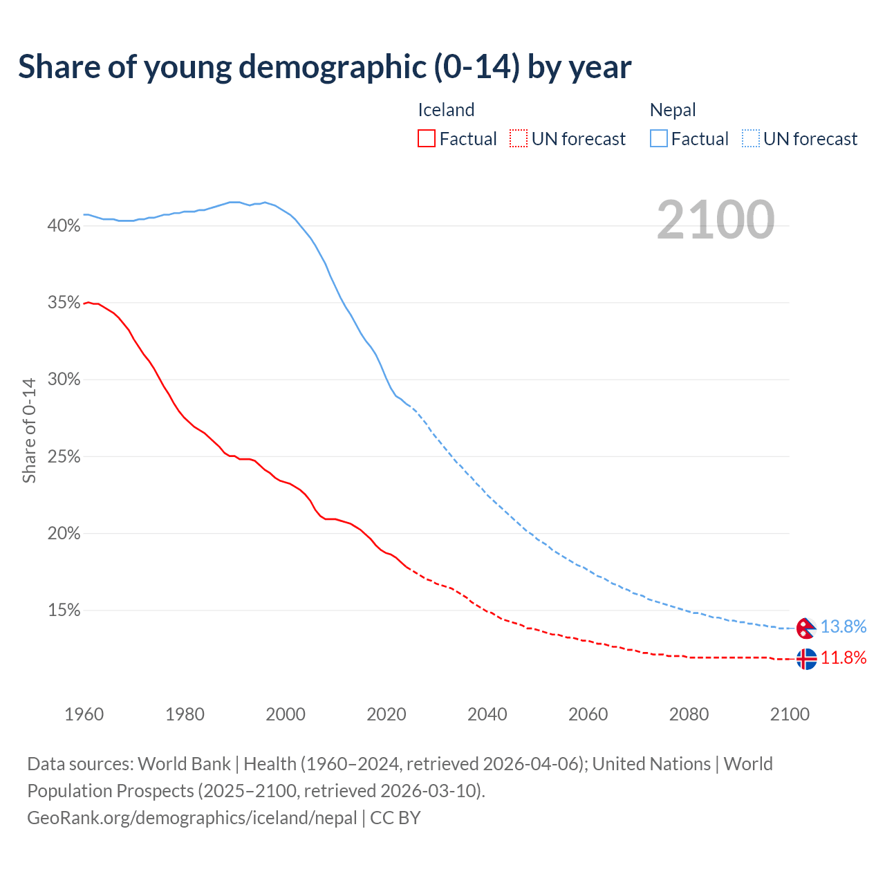 - The share of young demographic (0-15 years old) in Iceland is 17.8% vs 28.4% in Nepal.