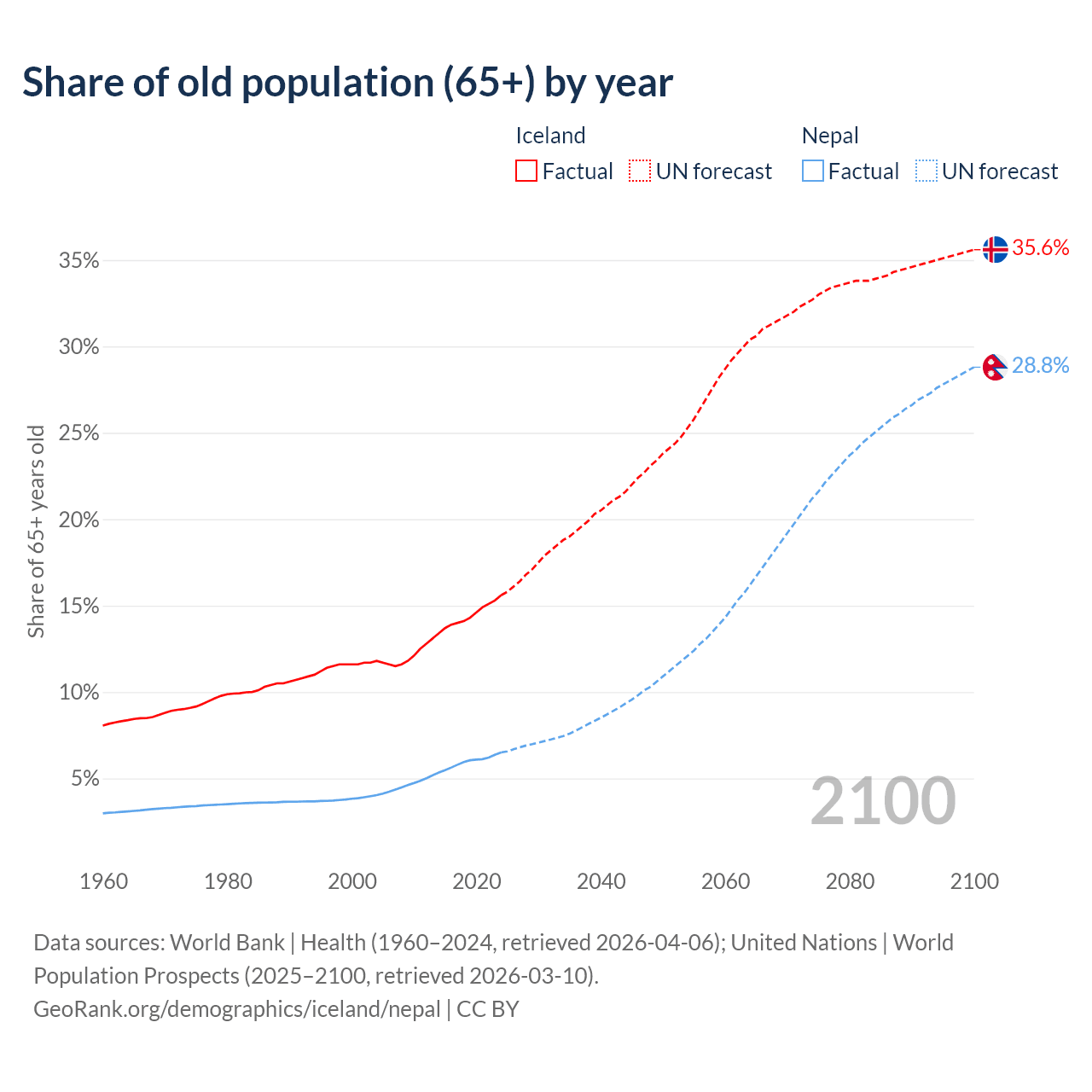 - The share of old-age demographic (65+) in Iceland is 15.6% vs 6.5% in Nepal.