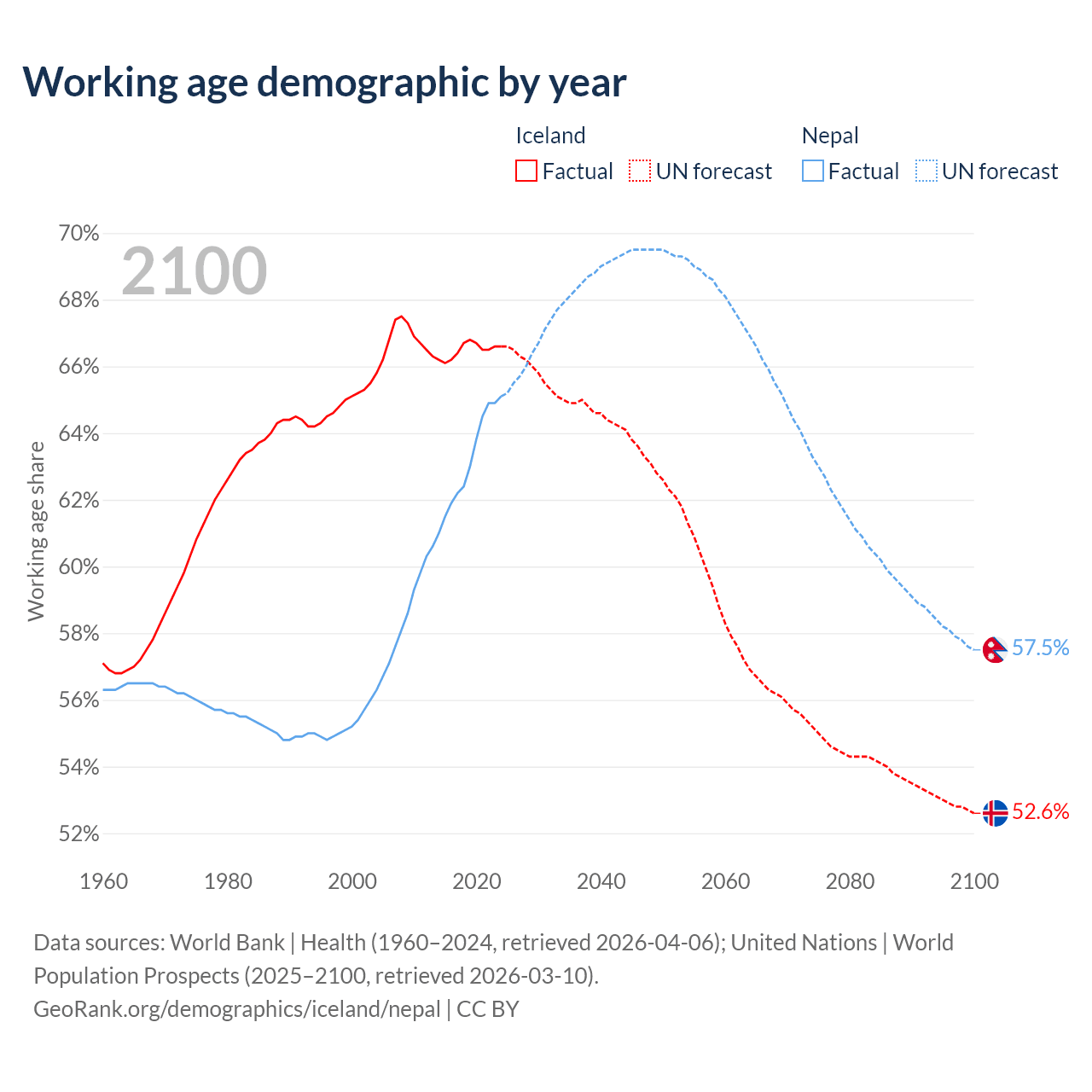 Median age Iceland vs Nepal, 1960-2100