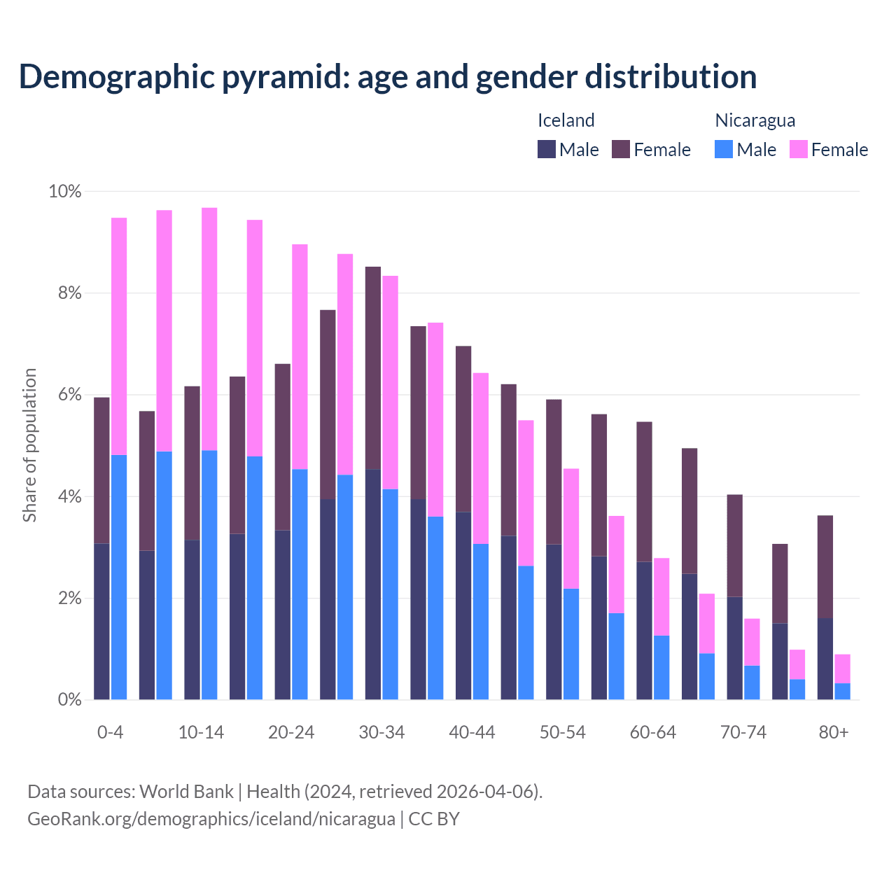 - As of 2026, the population of Iceland is 397K vs 7.12M in Nicaragua - 17.9 times difference.