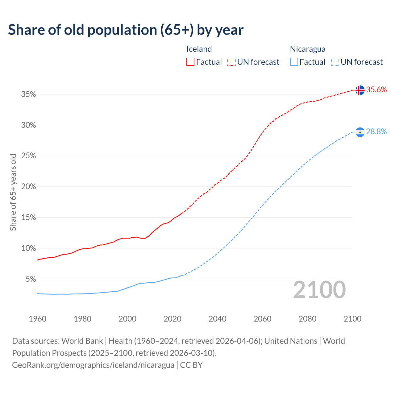 - The share of old-age demographic (65+) in Iceland is 15.6% vs 5.53% in Nicaragua.