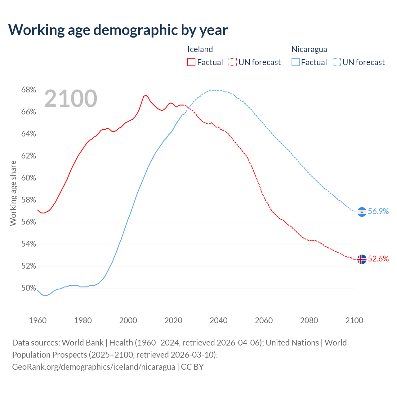 - Iceland has 264K working age adults (aged 15-64) vs 4.68M in Nicaragua.