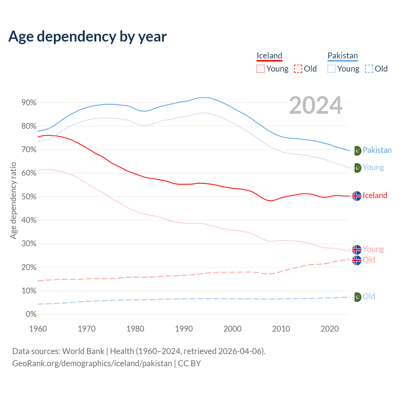 - The share of old-age demographic (65+) in Iceland is 15.6% vs 4.28% in Pakistan.