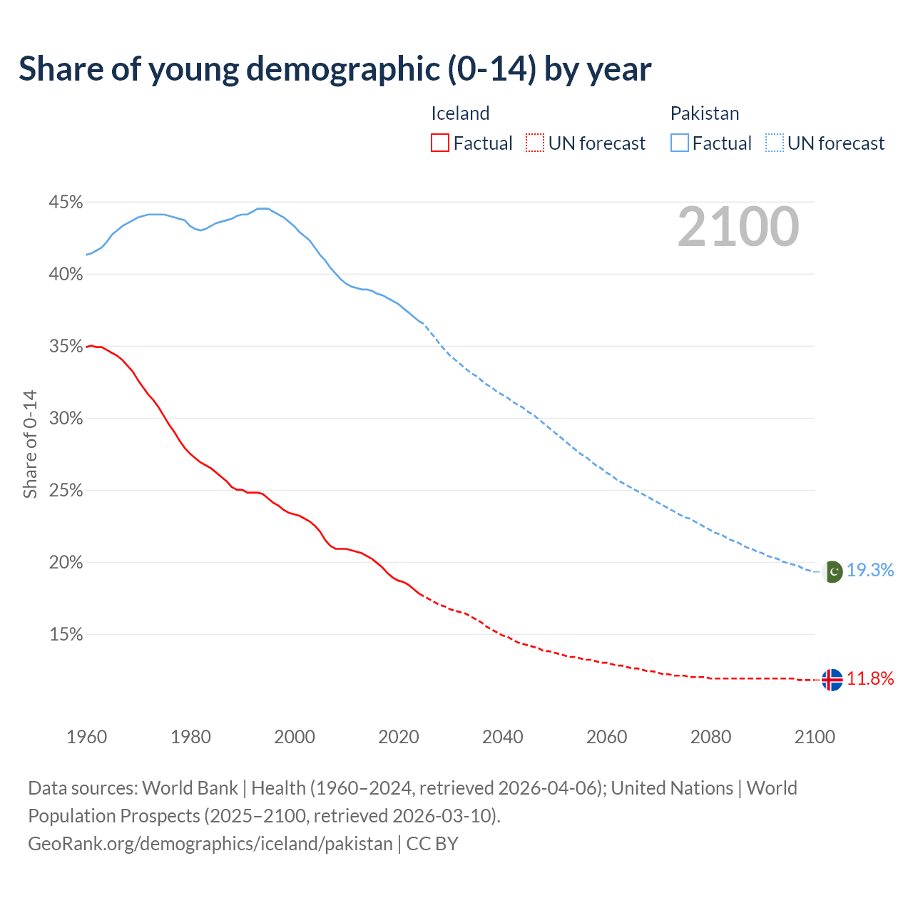 - The share of young demographic (0-15 years old) in Iceland is 17.8% vs 36.7% in Pakistan.