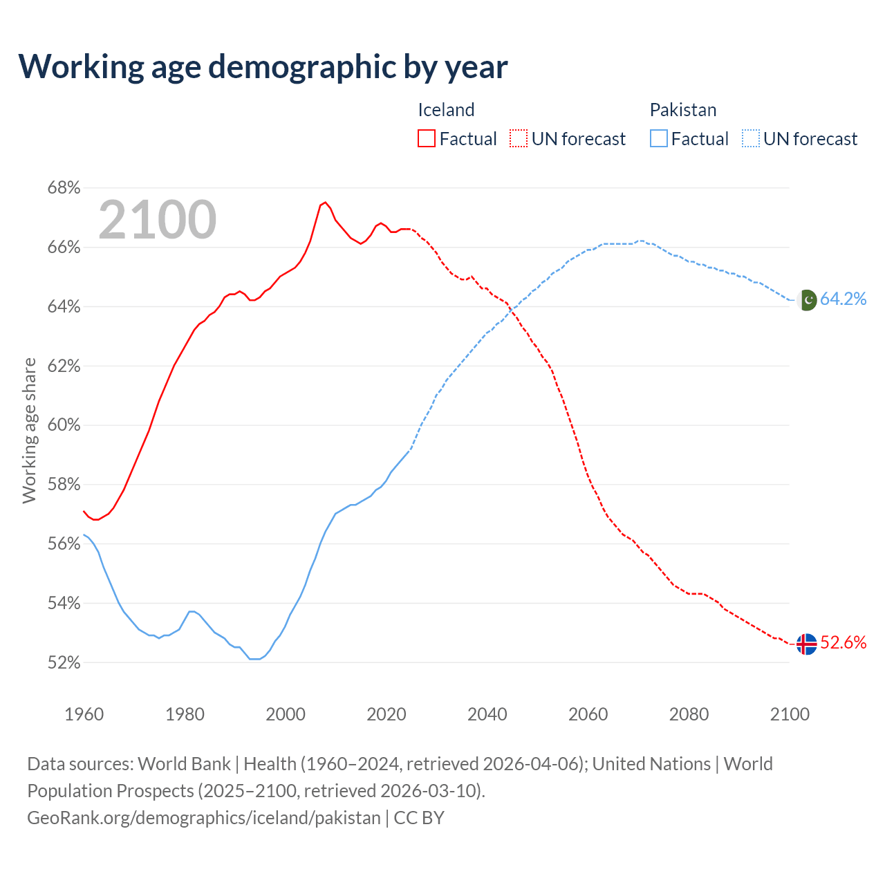 - Iceland has 264K working age adults (aged 15-64) vs 154M in Pakistan.