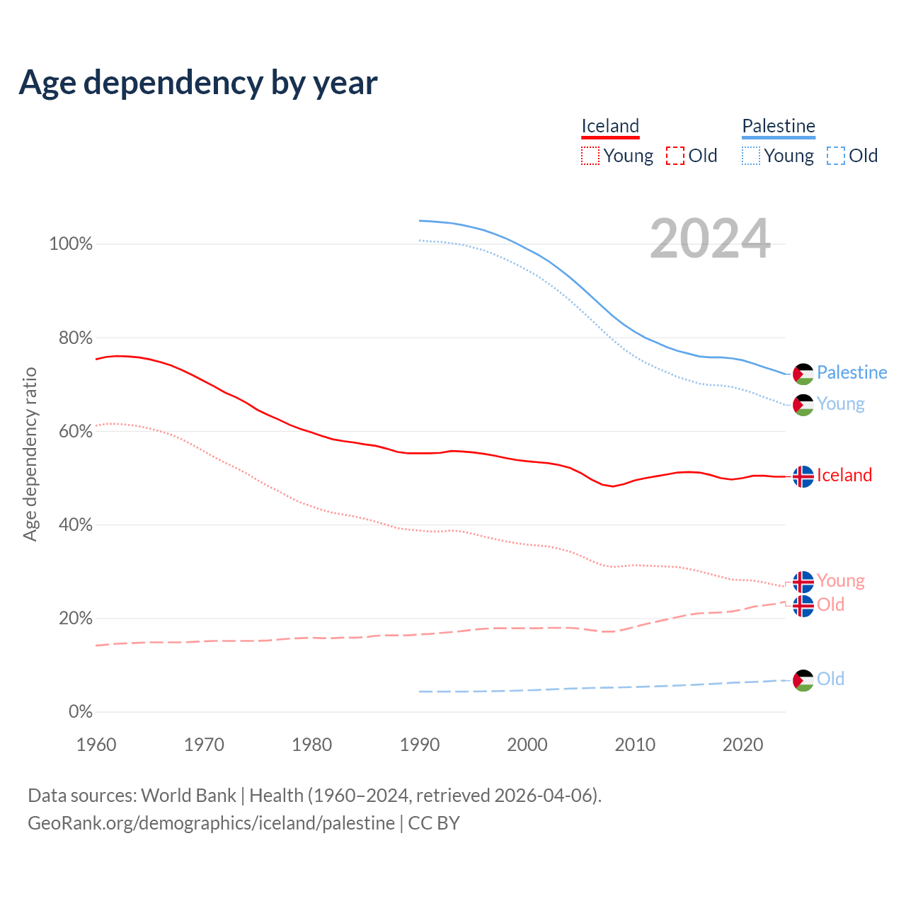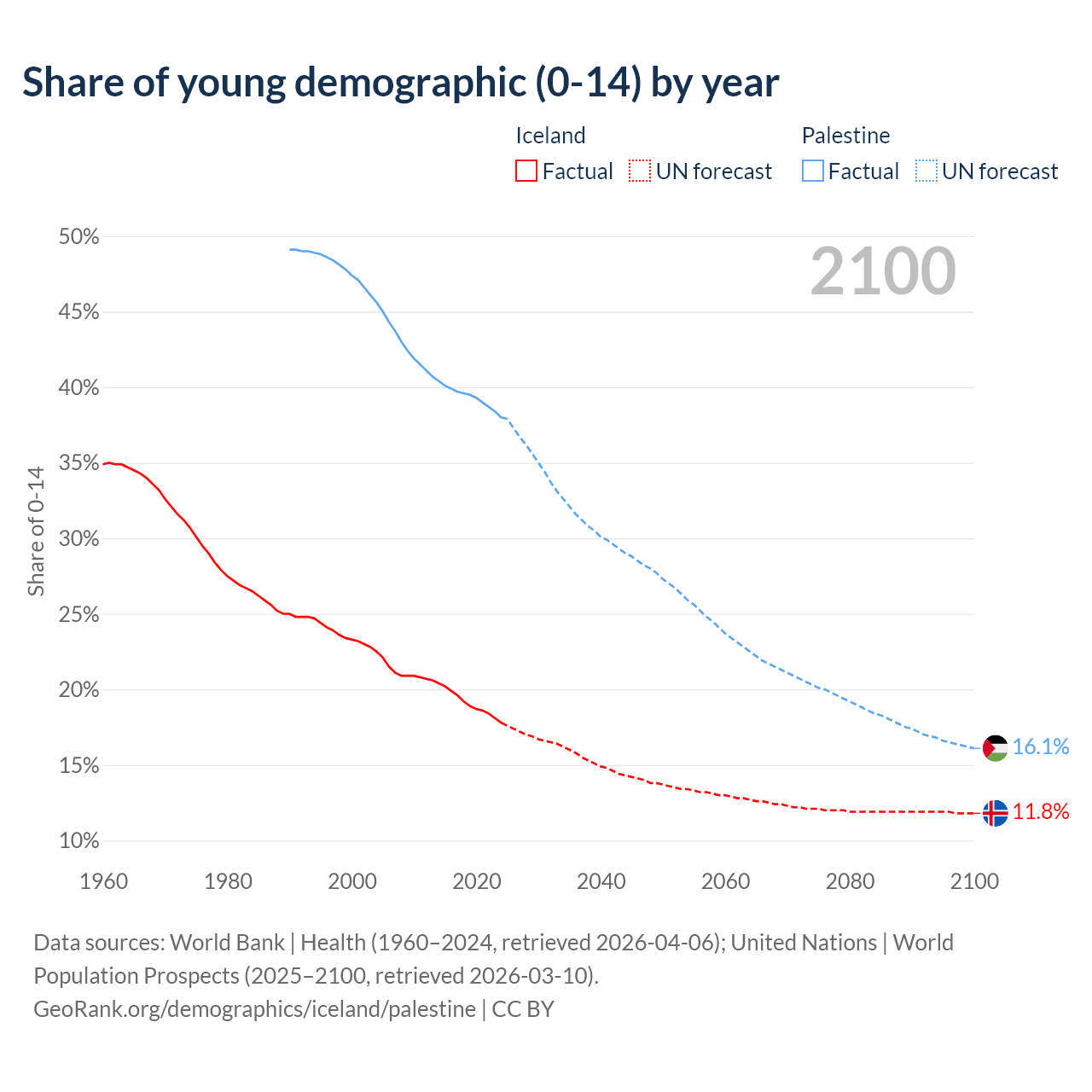 - The share of young demographic (0-15 years old) in Iceland is 17.8% vs 38% in Palestine.