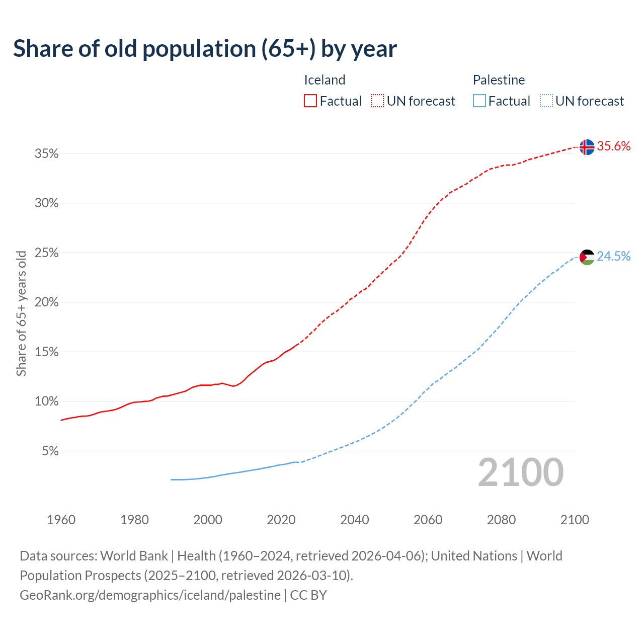 - The share of old-age demographic (65+) in Iceland is 15.6% vs 3.84% in Palestine.