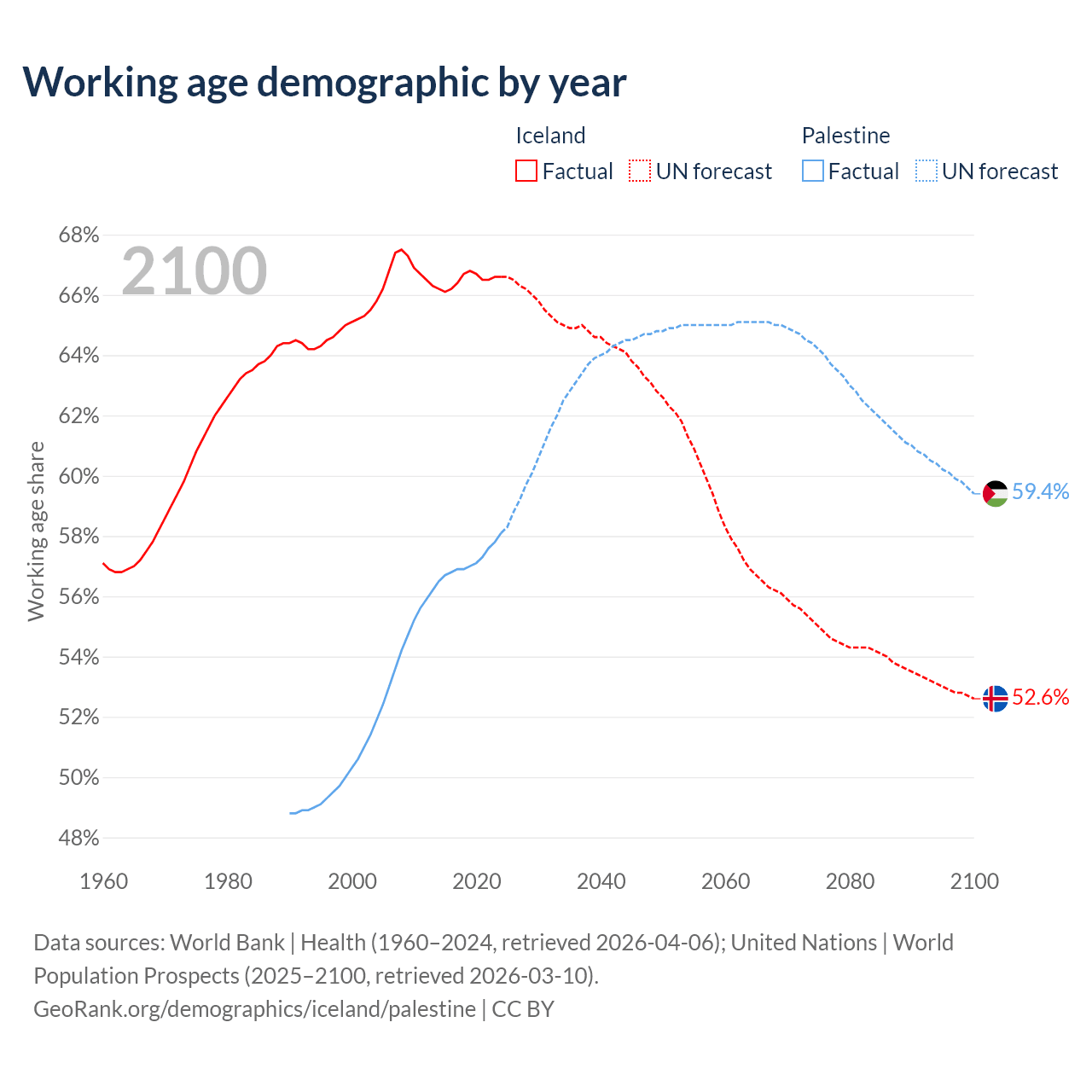 - Iceland has 264K working age adults (aged 15-64) vs 3.2M in Palestine.