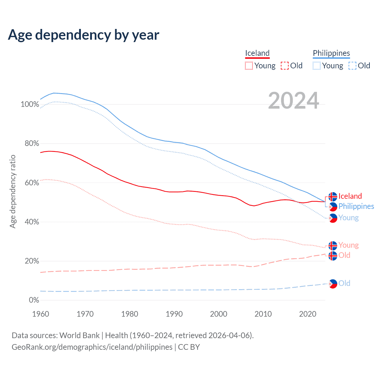 Data sources: World Bank | Health (1960–2024, retrieved 2026-04-06); U.S. Census Bureau (1960–2024, retrieved 2026-02-08).