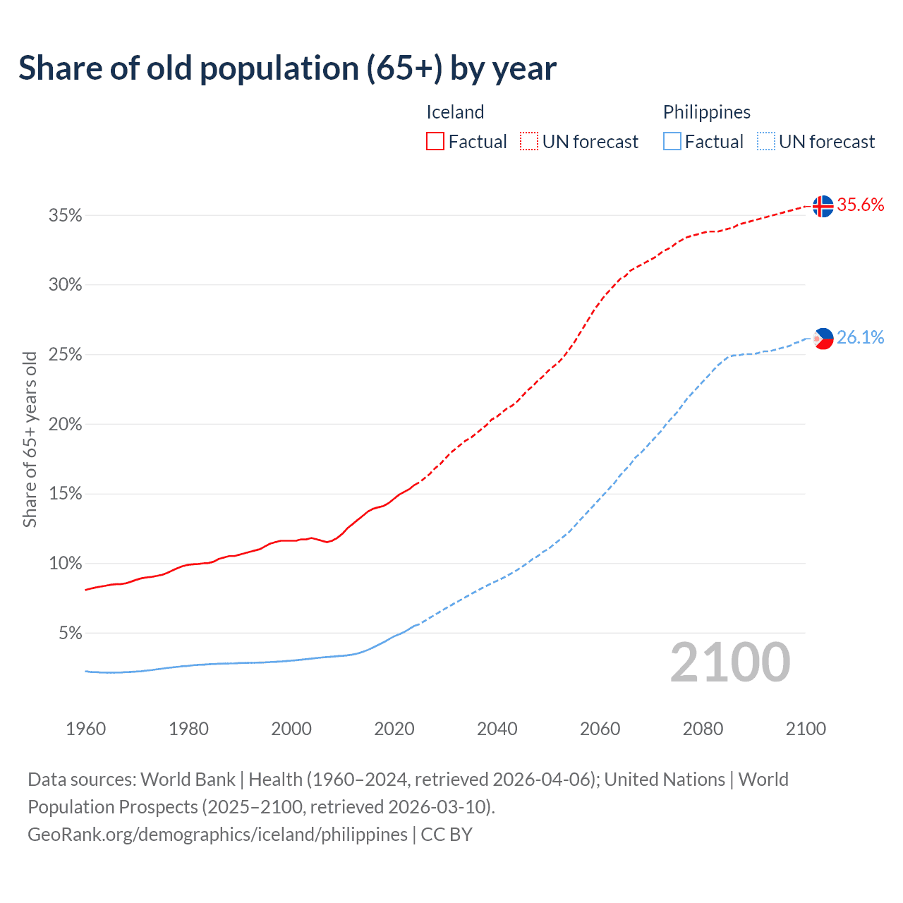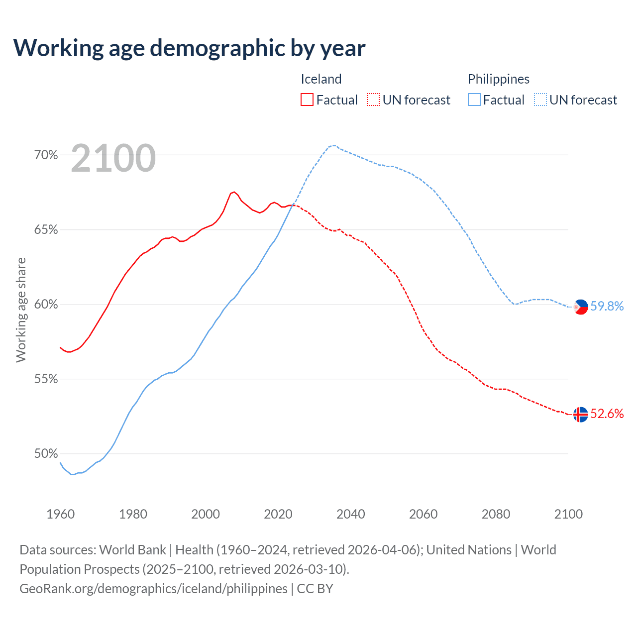 Median age Iceland vs Philippines, 1960-2100