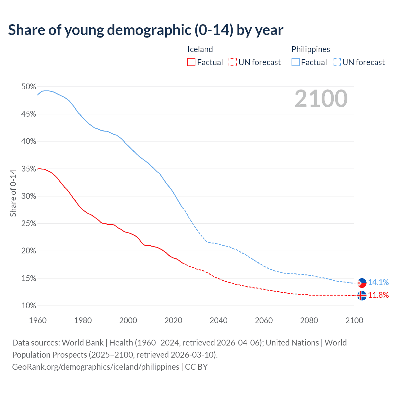 - The share of young demographic (0-15 years old) in Iceland is 17.8% vs 27.9% in the Philippines.