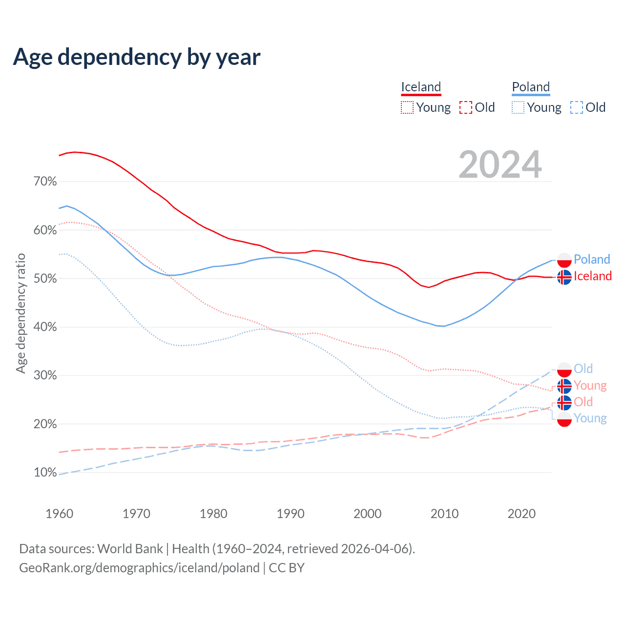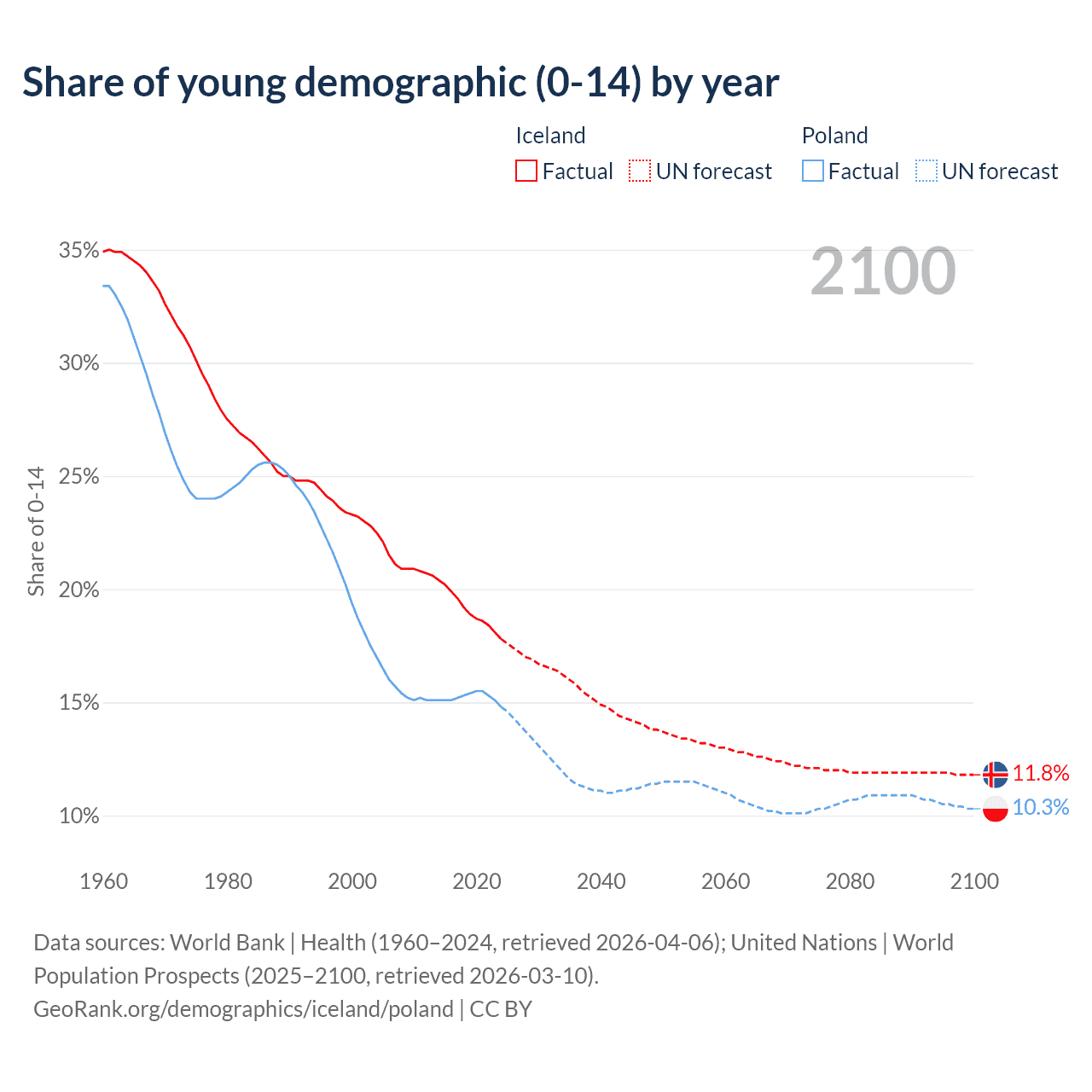 - The share of young demographic (0-15 years old) in Iceland is 17.8% vs 14.8% in Poland.