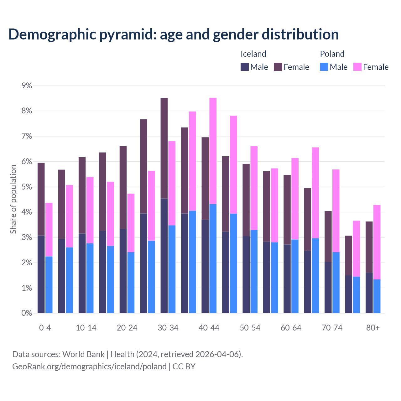 - As of 2026, the population of Iceland is 397K vs 35.8M in Poland - 90.2 times difference.