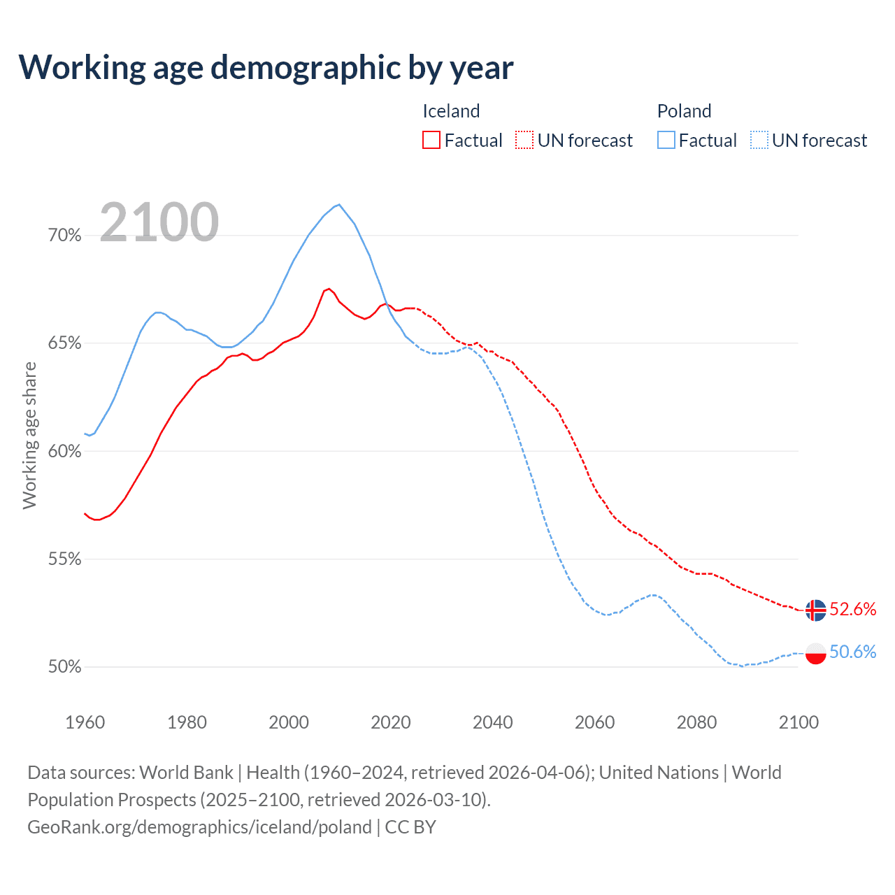 - Iceland has 264K working age adults (aged 15-64) vs 23.3M in Poland.