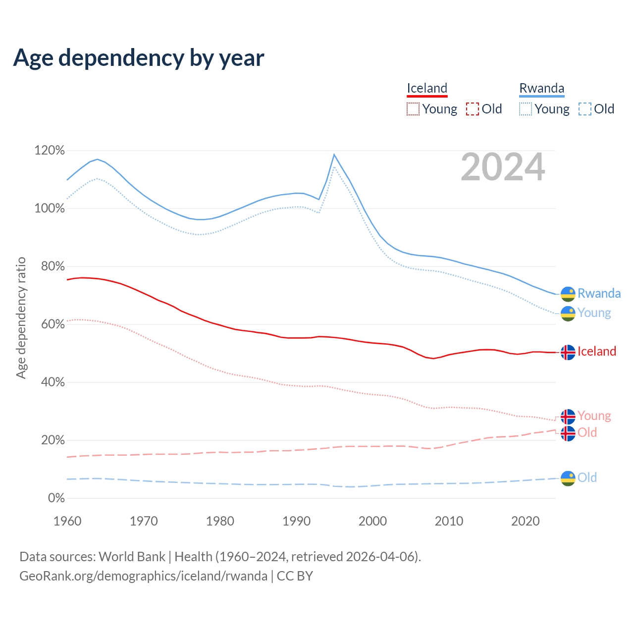 - Iceland is ranked 65/196 by median age (oldest to youngest) vs 160/196 for Rwanda.