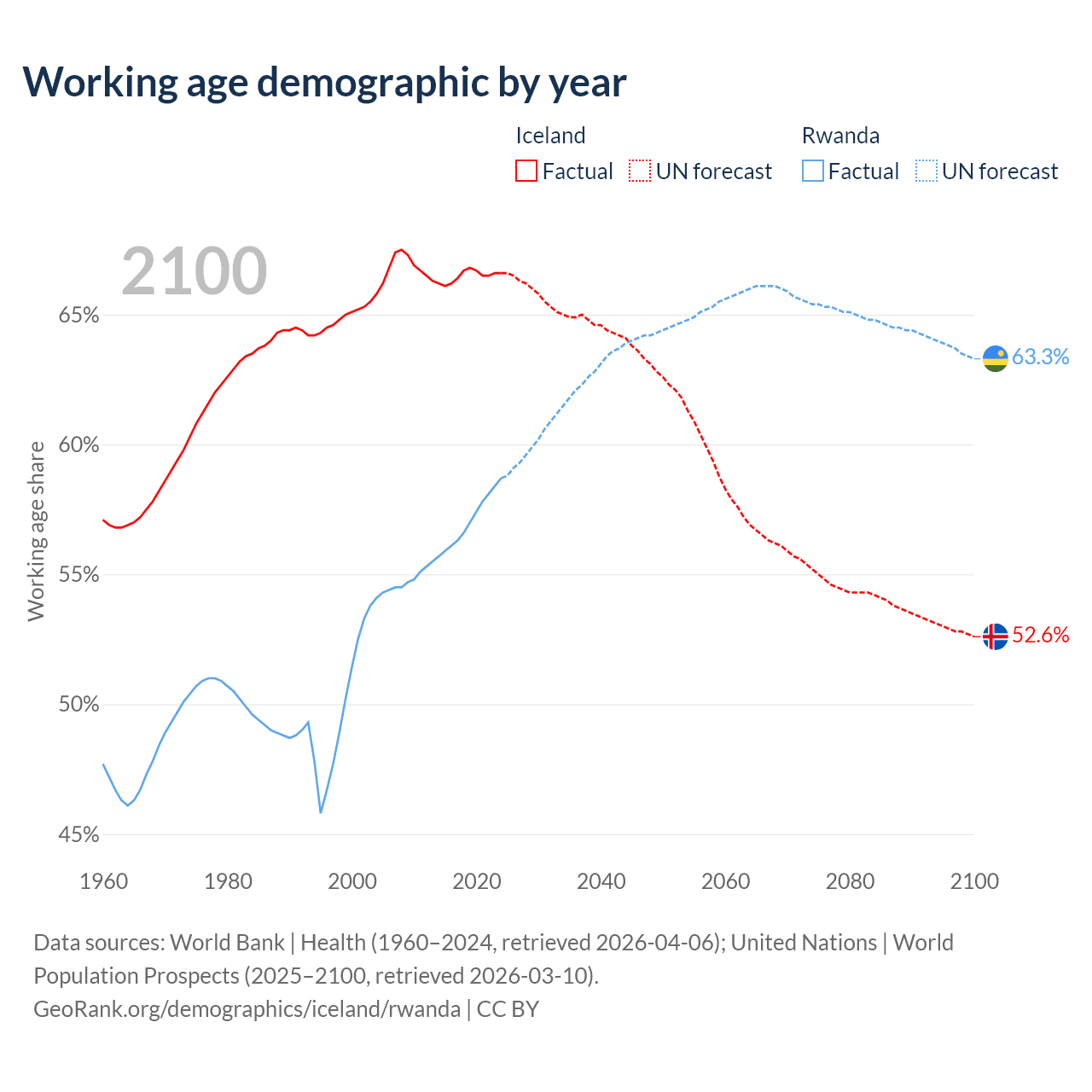 - Iceland has 264K working age adults (aged 15-64) vs 8.79M in Rwanda.