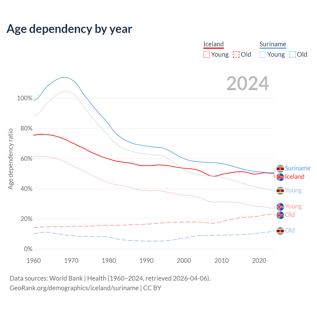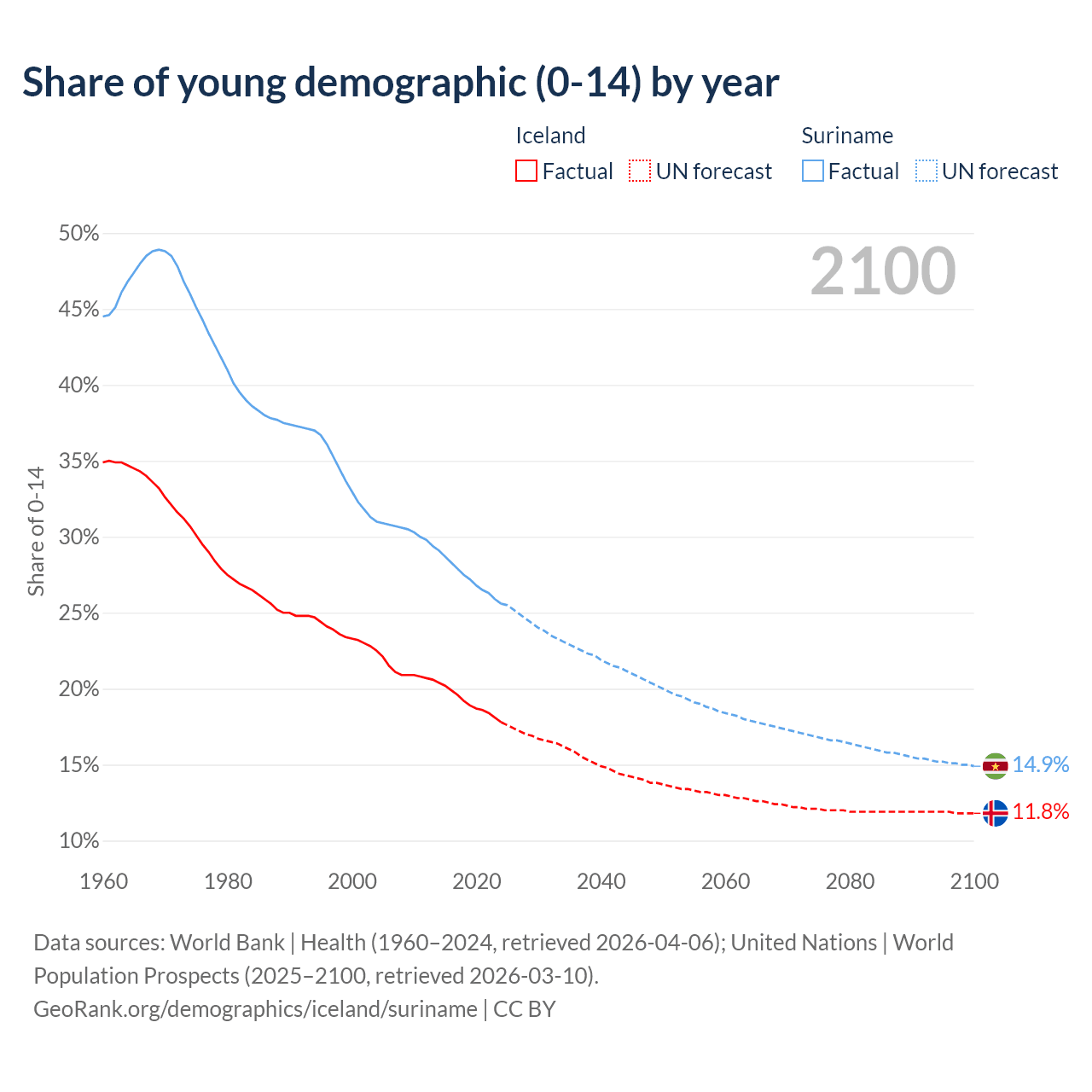 - The share of young demographic (0-15 years old) in Iceland is 17.8% vs 25.6% in Suriname.