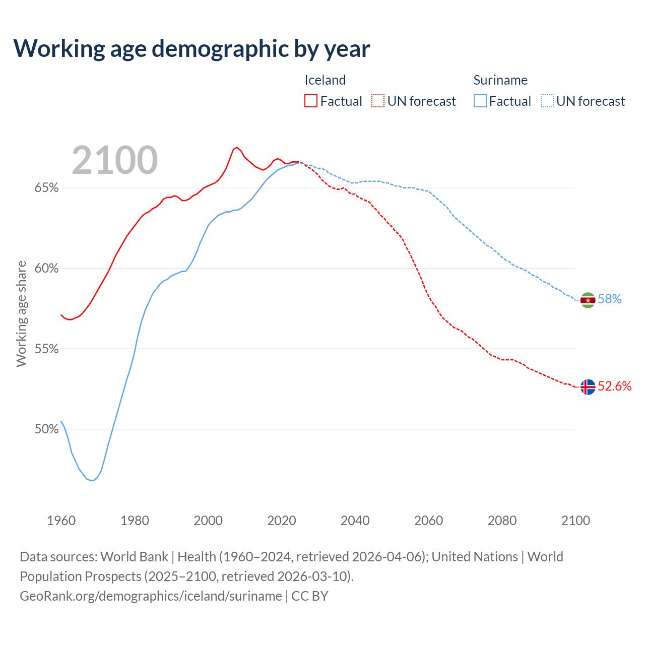 Median age Iceland vs Suriname, 1960-2100