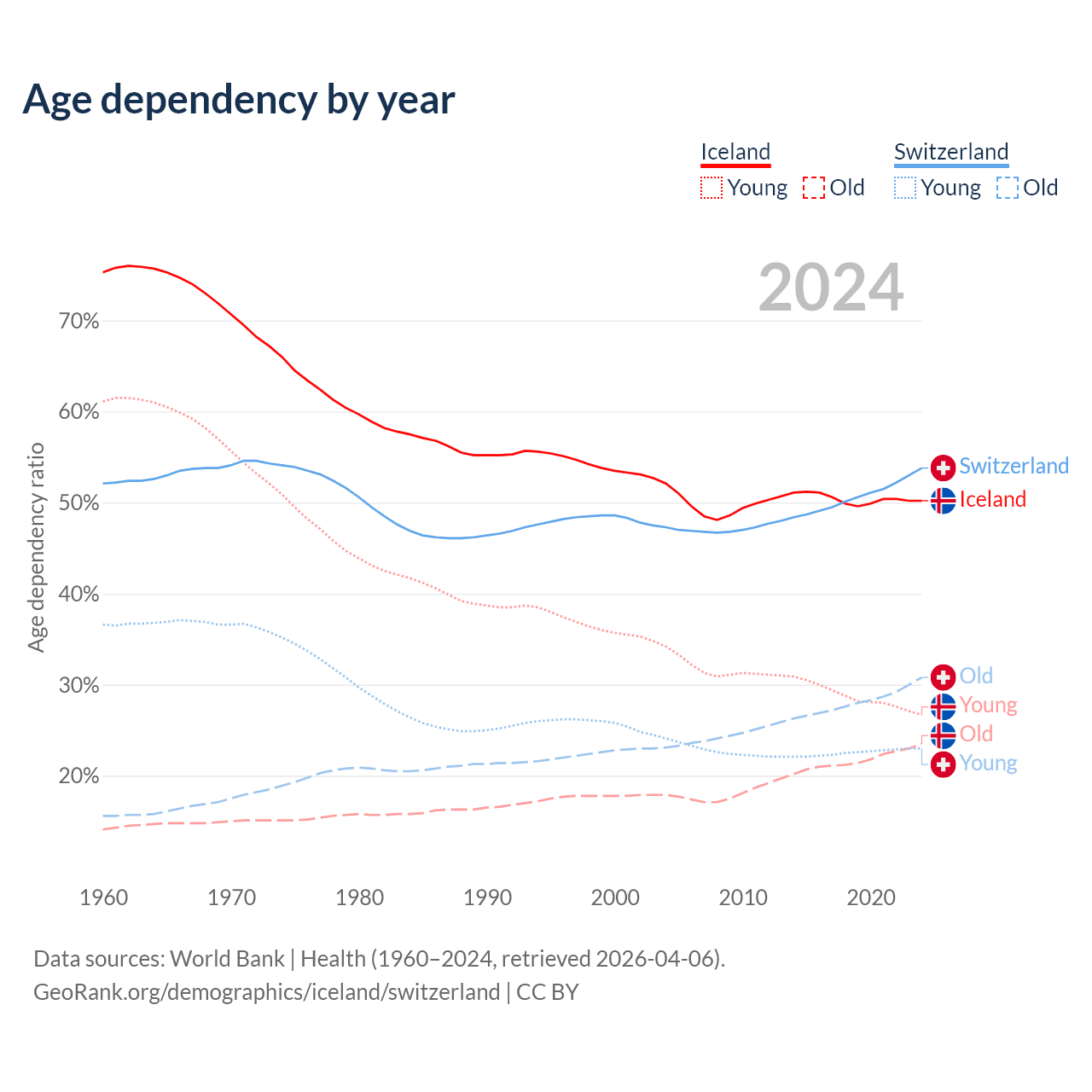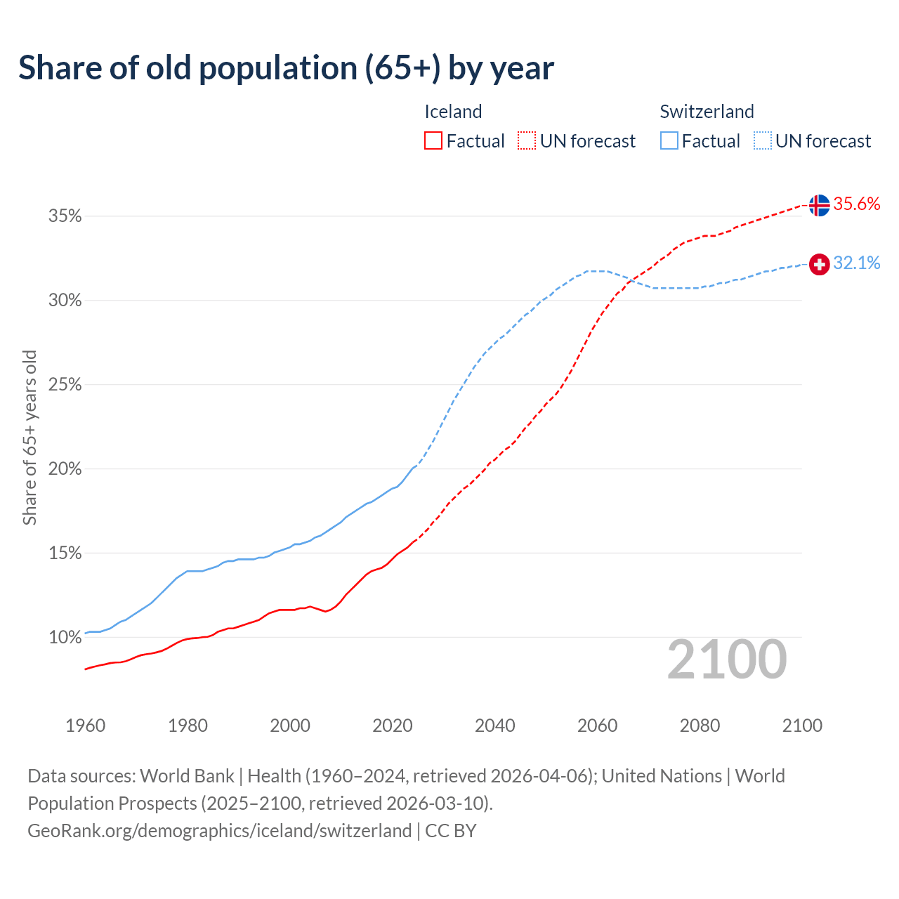 The share of older people aged 65 and over is 15.6% in Iceland and 20% in Switzerland. Life expectancy in Iceland compared to Switzerland .