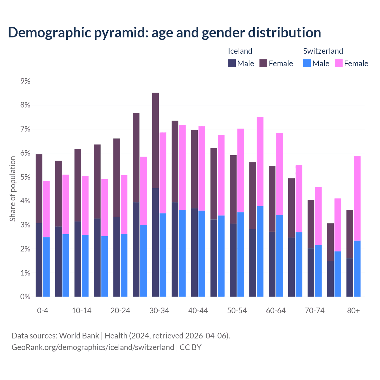 - Iceland is ranked 65/196 by median age (oldest to youngest) vs 24/196 for Switzerland.