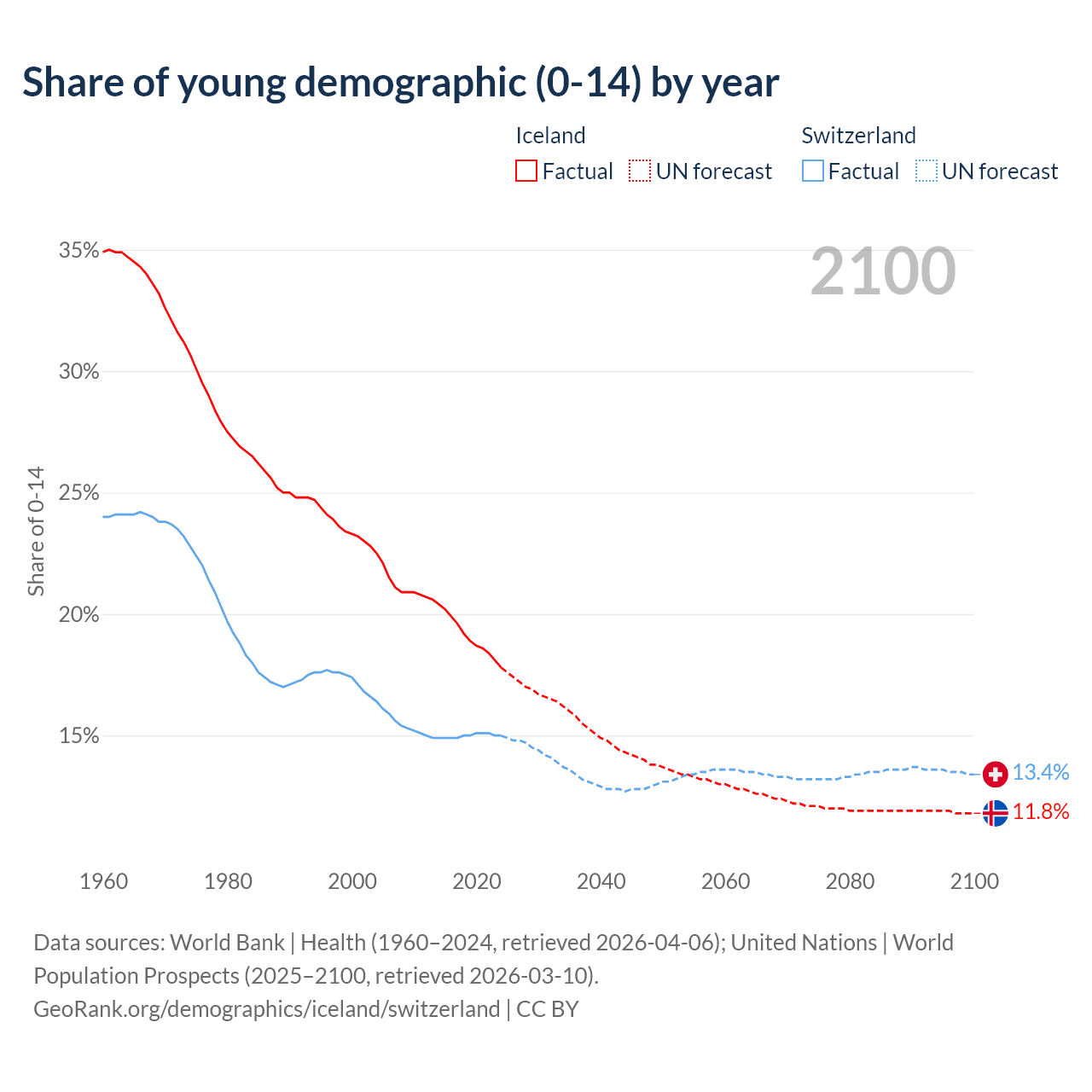 - The share of young demographic (0-15 years old) in Iceland is 17.8% vs 15% in Switzerland.